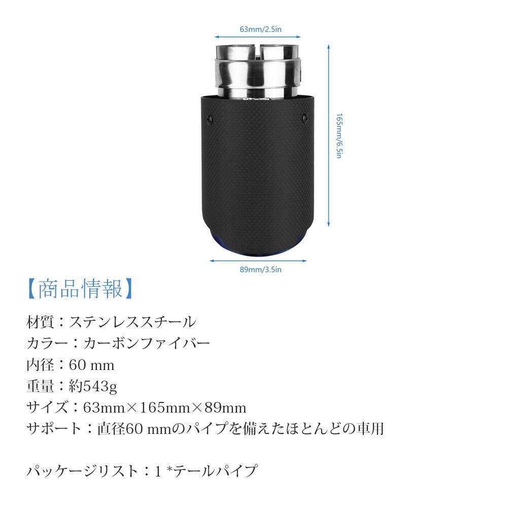 【商品情報】材質:ステンレススチール、カーボンファイバー カラー:ブラック. 内径:60 mm. 重量:約543g. サイズ:63mm×165mm×89mm. サポート:直径60 mmのパイプを備えたほとんどの車用. パッケージリスト:1 *テールパイプ