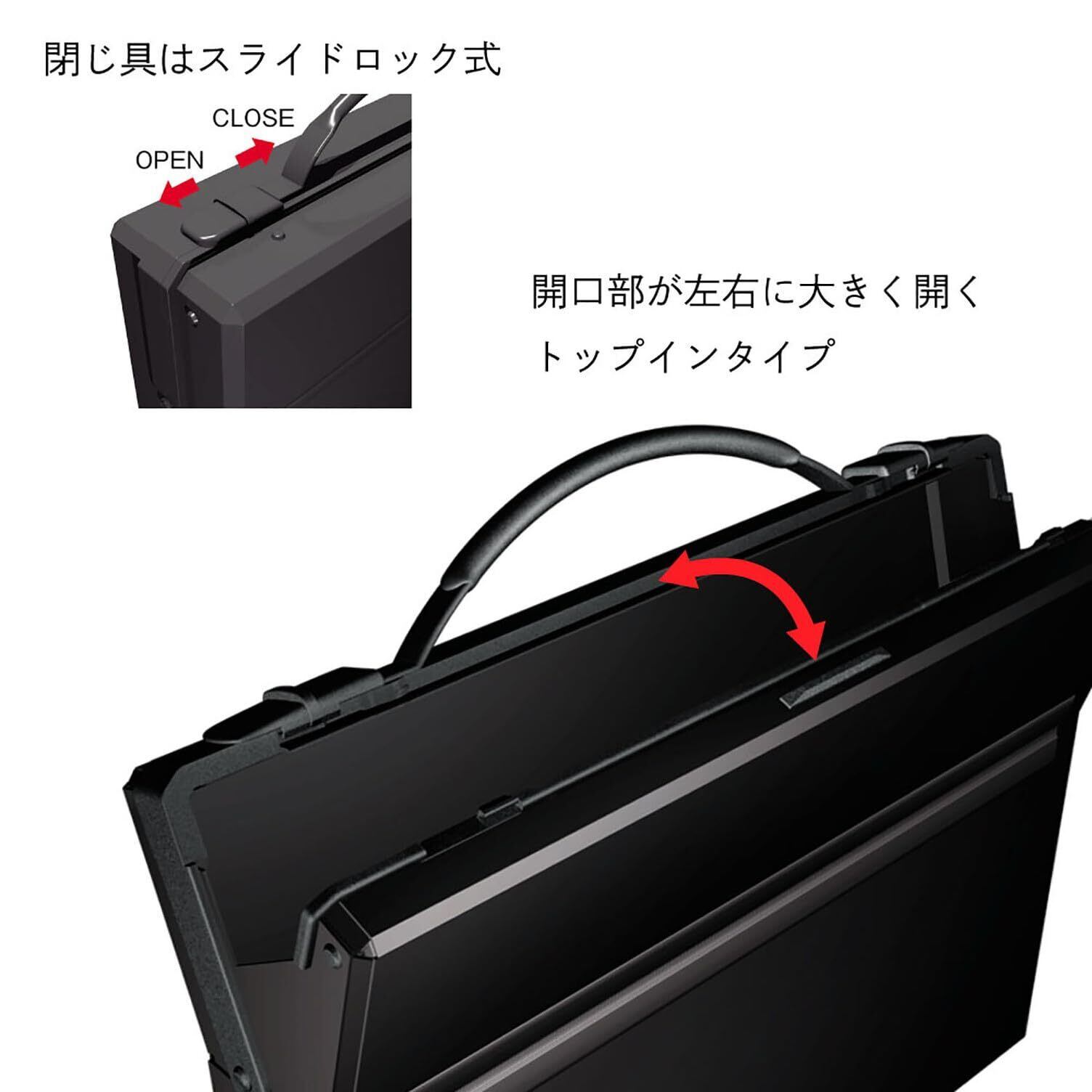 ●バッグの上部がワイドに開き、出し入れもスムーズ。新機構のダレスバッグ。●開口部が大きく左右に開くトップインタイプなので中の書類がひとめでわかり、書類の出し入れが素早く出来ます。●外側にスライドさせるだけのカンタン開閉で手間取りません。●A4サイズのファイルがラクラク入り、3kgまで収納可能。