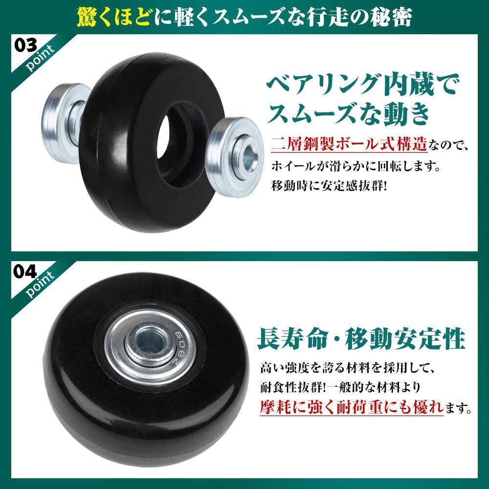 【静音タイプ-衝撃や振動の吸収】高品質のPUゴムの外輪材料で、耐磨耗性も優れ、衝撃や振動を吸収し、非常に静かに走ることができます。スーツケース キャスターはテンレス製ベアリングを内蔵しているので、各車輪は50キロの耐荷重があり、路面が荒れていても、スムーズに走行することができます。