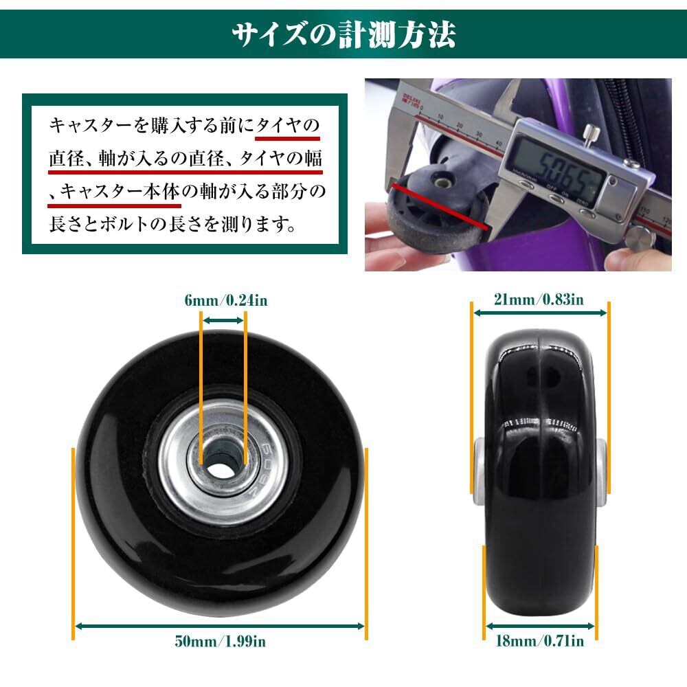 【商品サイズ】:スーツケース キャスター 交換 車輪は輪外径50mm、輪幅18mm、軸受部幅21mm、輪中心軸孔径6mm。30mm、35mm、60mmの3種類のボルトが付いております。【車輪交換と修理用】ご愛用のスーツケースやキャリーバッグ などの車輪が劣化すると、この車輪用修理キットで簡単に交換できます。初心者でも簡単に取り付けます。消耗したキャスターを自分で簡単に交換!ご購入前には必ずキャスターのサイズをご確認ください。