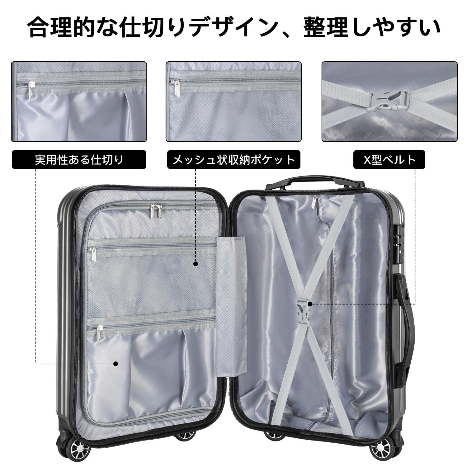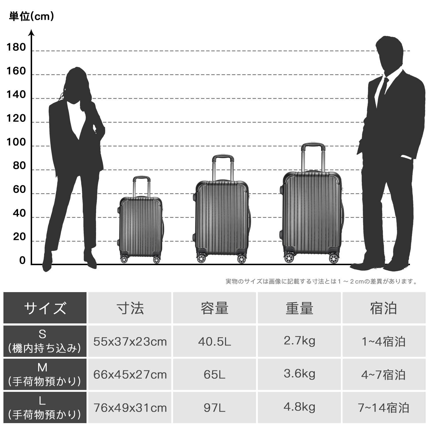 【材質&TSAダイヤル式ロック】スーツケースはABS樹脂とPCでの混合素材で作られ、耐衝撃性に優れた上、高弾性で、変形しにくい。エンボス加工、傷つきにくい。アルミフレームスーツケースより軽量で持ち歩きやすい。TSAダイヤル式ロックが搭載されて、外出がより安全。また、鍵穴は航空会社検査専用の物です。本製品に鍵は付属しておりません。