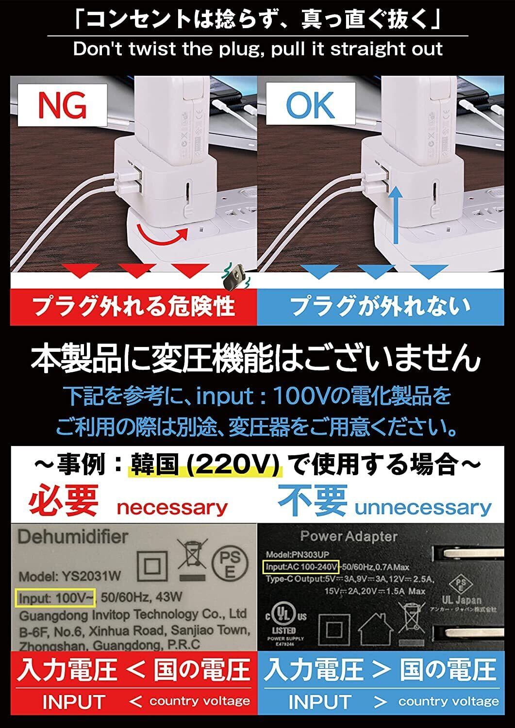 本製品はコンセントの形状を変換するための「変換プラグ」であり、変圧機能はございません。なお、本製品は日本国内ではご使用いただけませんので、あらかじめご了承ください。韓国、中国、アメリカ、イギリス、ヨーロッパなど、世界200カ国以上のプラグに対応します。 B、B3タイプは非対応のため、使用国のプラグタイプをご確認ください。本製品は海外での使用を目的としているため、日本国内の電気規格(PSE)を取得しておりません。