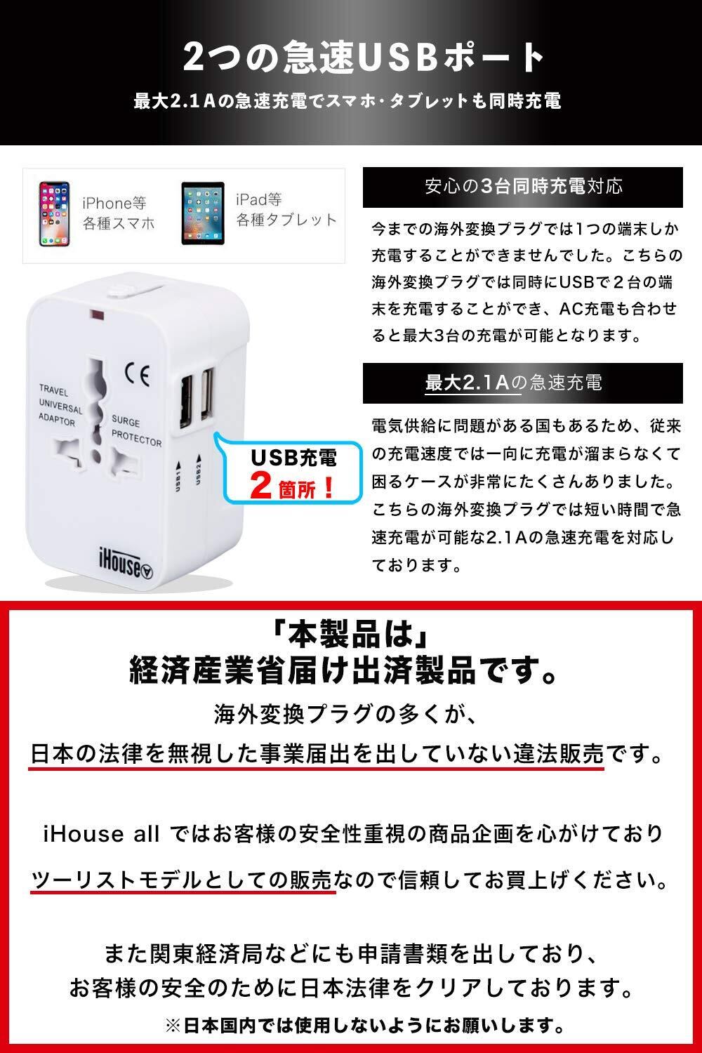 iHouse all 海外変換プラグ 充電 コンセント 海外旅行 2USBポート 全世界対応 経済産業省承認 Aタイプ Cタイプ Oタイプ BFタイプ 正規1年 (ブルー)