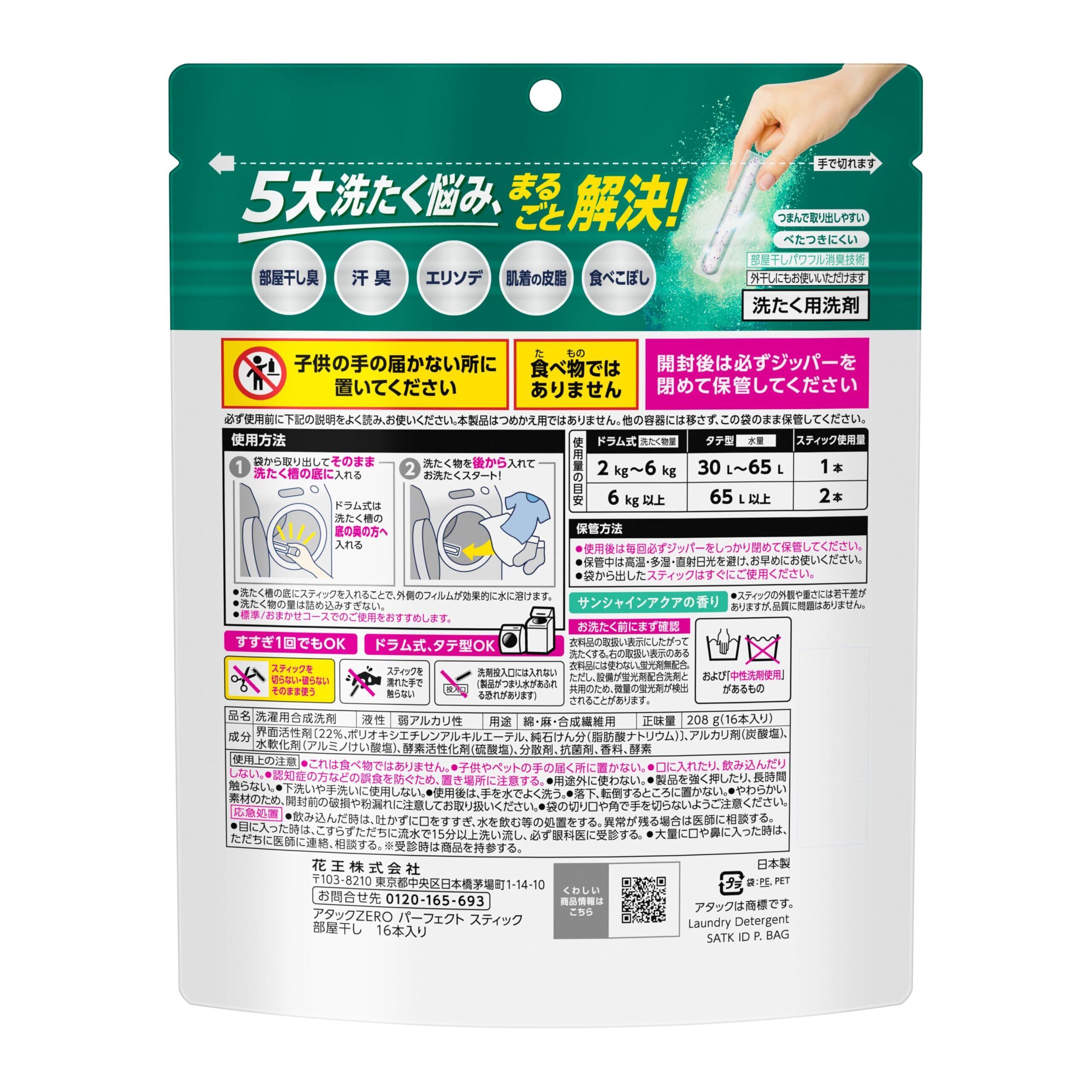 アタックZERO パーフェクトスティック 部屋干し 洗濯洗剤 じめじめ部屋干し臭・汗臭、まるごと一発洗浄! サンシャインアクアの香り 16本入り