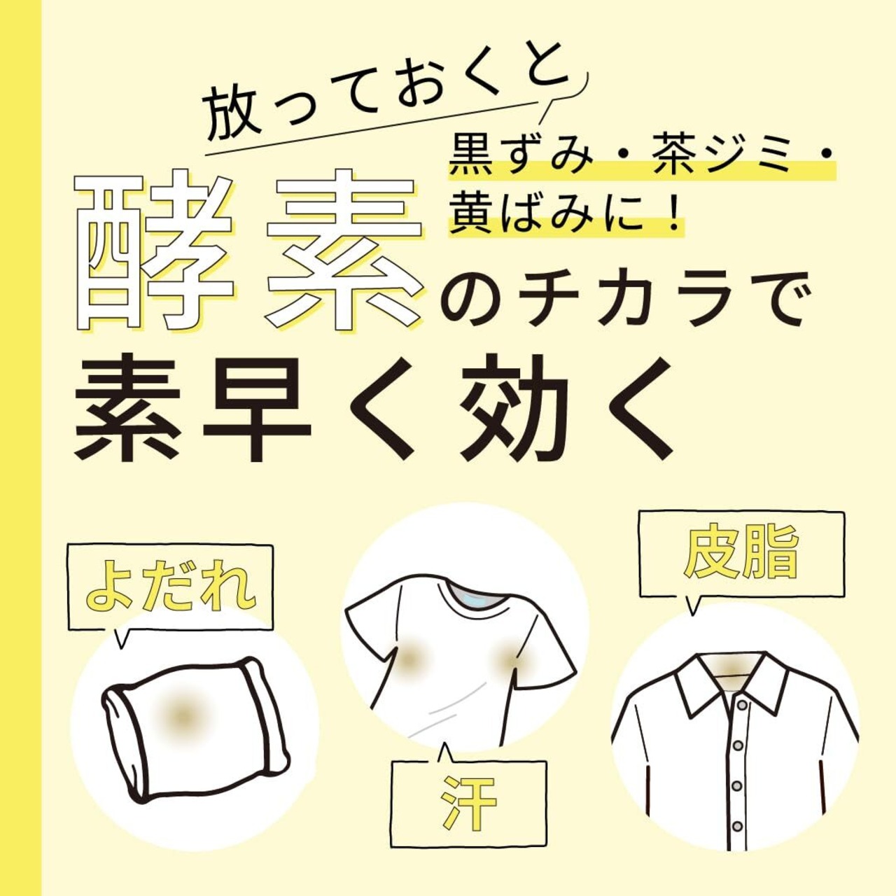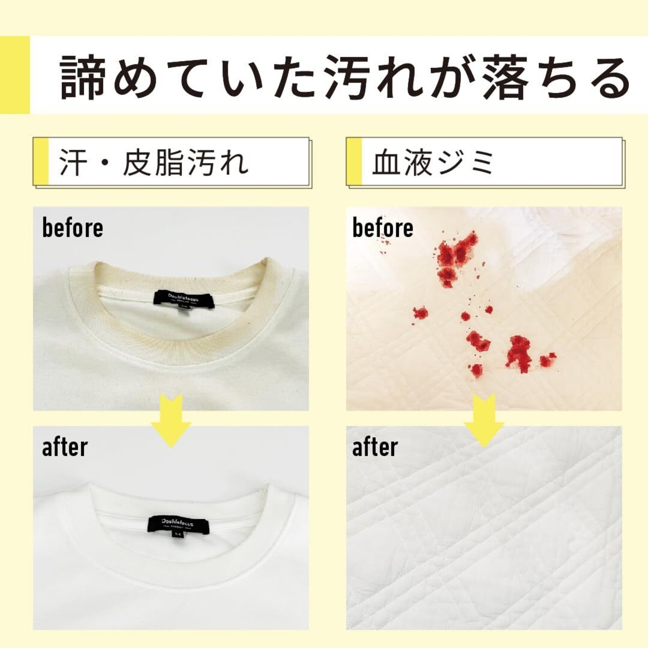 【あきらめていた汚れが、つけ置きだけでスッキリ】 血液・皮脂・黒ずみ・汗ジミ・黄ばみなど、通常の洗剤では落ちにくい汚れをごっそり除去。