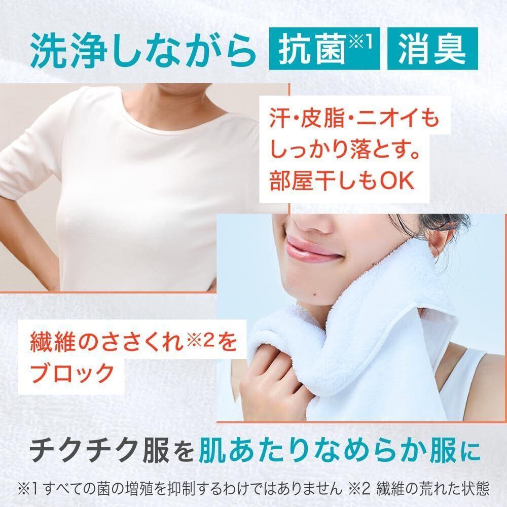 365日、肌に触れつづける衣類だからこそ、肌への刺激※1はできるだけ抑えたい乾燥性敏感肌の方に。 洗たく中の衣類擦れから守って、繊維のささくれ※2をブロックし、チクチク不快感を緩和。 <皮膚科医協力のもと乾燥性敏感肌の方による使用テスト済※3>(肌に塗るものではありません) <繊維なめらか改質洗浄成分>洗浄しながら、チクチク服を肌あたりなめらか服に変える。 <抗菌※4・消臭・部屋干しOK>衣類に残したくない汗や皮脂汚れを落とし、ニオイ菌※5の増殖まで抑制※4。 ●赤ちゃんの衣類にも ●蛍光剤※6・漂白剤・着色料無添加 ※1衣類のチクチク・ゴワつきによる不快感 ※2繊維の荒れた状態 ※3すべての方に皮膚刺激が起こらないというわけではありません ※4すべての菌の増殖を抑制するわけではありません ※5生乾き臭の原因菌 ※6設備が蛍光剤配合洗剤と共用のため、微量の蛍光剤が検出されることがあります