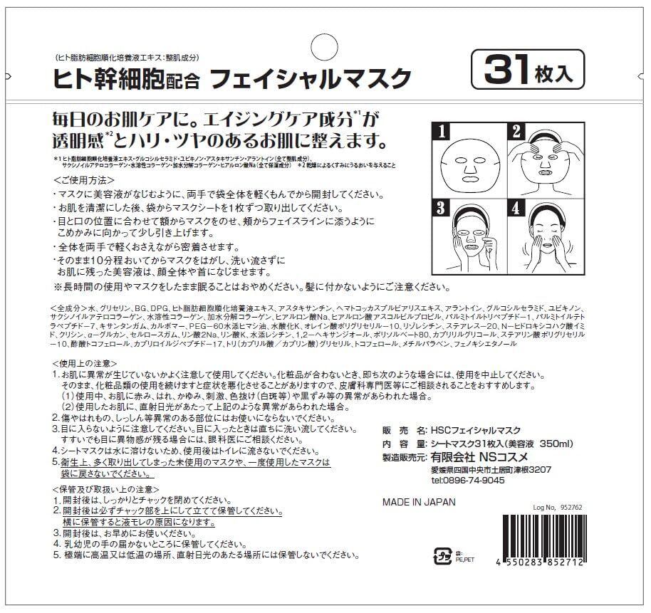 EVERYYOU(エブリユー) STEM CELL MASK 31枚入 1枚4役(化粧水・乳液・美容液・マスク) ヒト幹細胞傾化培養液(整肌成分)配合