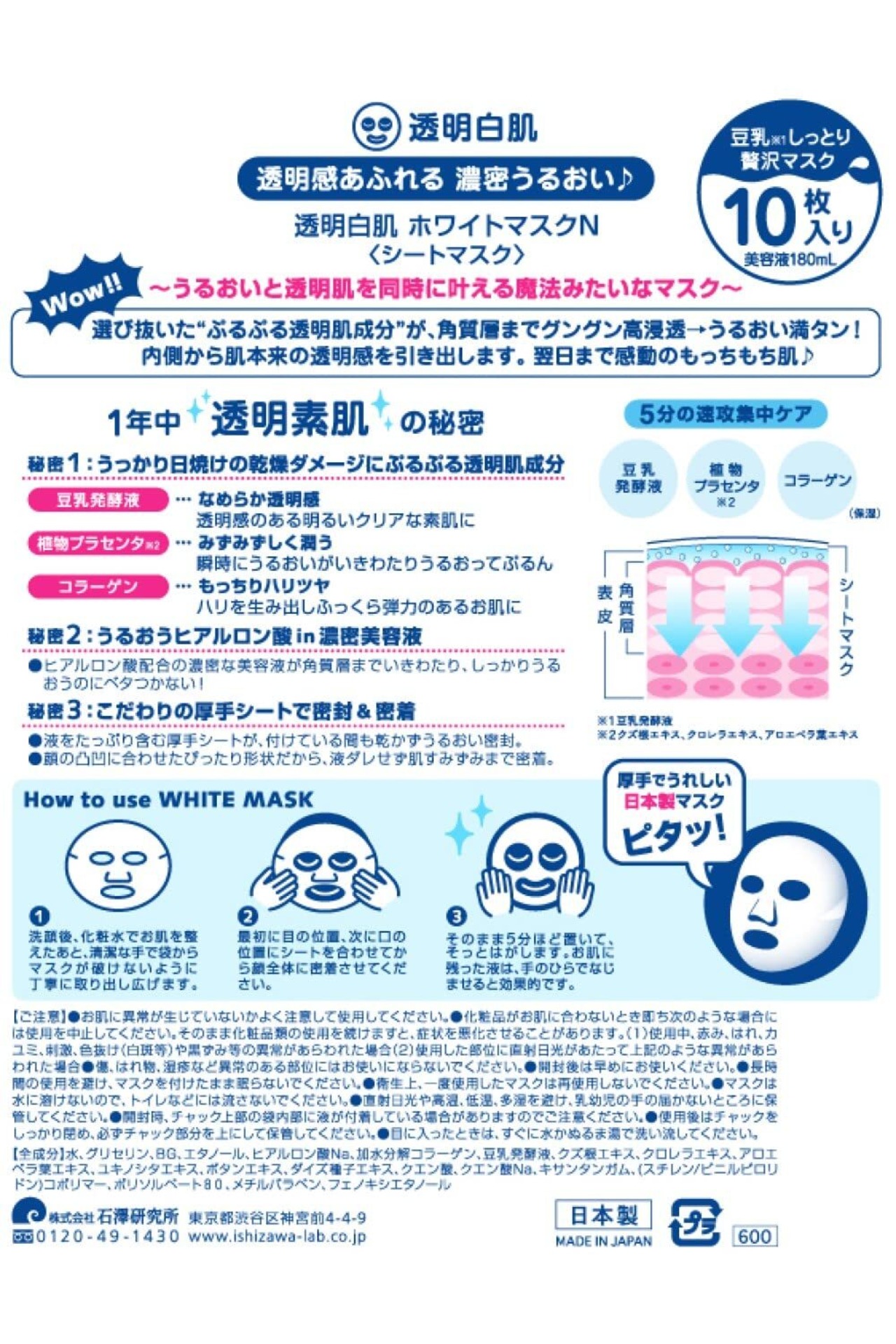透明白肌 ホワイトマスクN 乾燥肌 古い角質によるくすみ うるおい 透明感 美容液 シートマスク 日本製 10枚入り
