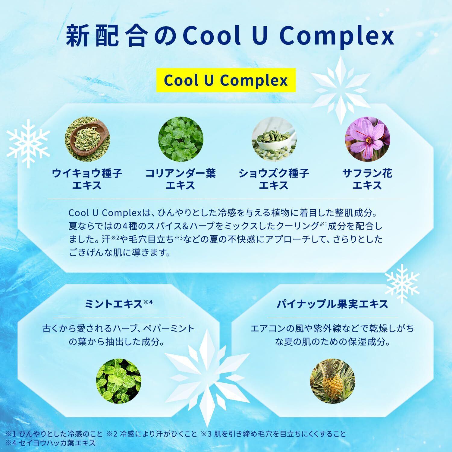 夏肌対策!ミントエキス、パイナップル果実エキス、ウイキョウ種子エキス、コリアンダー葉エキス、ショウズク種子エキス、サフラン花エキスの6種の美容成分配合。