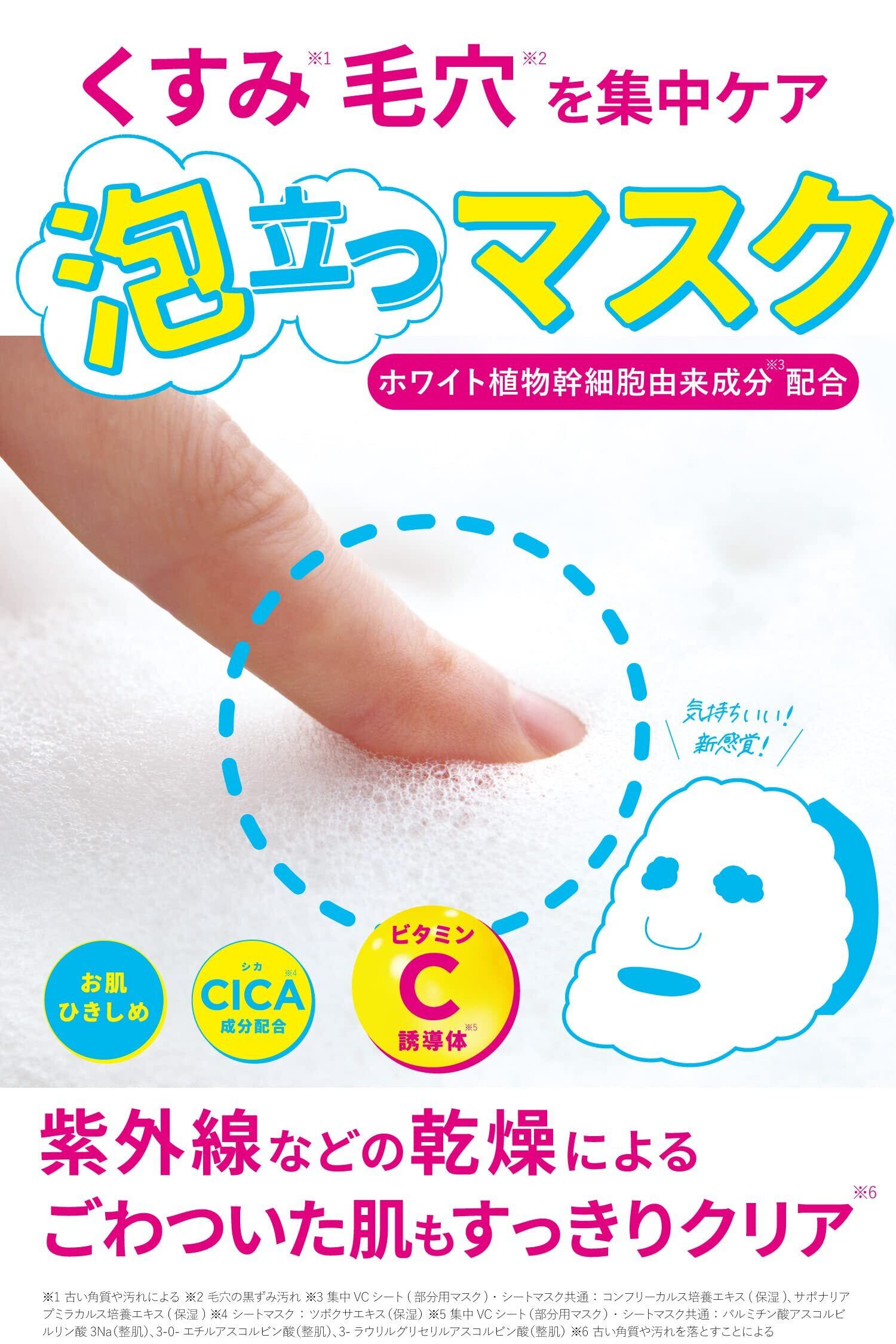 *1 古い角質や汚れによる *2 毛穴の黒ずみ汚れ *3 古い角質や汚れを落とすことによる *4 集中VCシート(部分用マスク)・シートマスク共通:パルミチン酸アスコルビルリン酸3Na(整肌)、3-O-エチルアスコルビン酸(整肌)、3-ラウリルグリセリルアスコルビン酸(整肌) *5 シートマスク:ツボクサエキス(保湿) *6 集中VCシート(部分用マスク)・シートマスク共通:コンフリーカルス培養エキス(保湿)、サポナリアプミラカルス培養エキス(保湿)