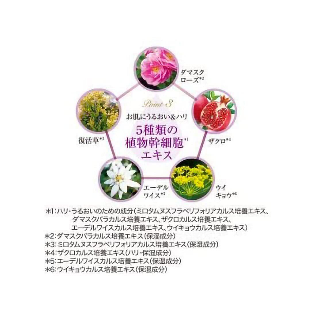 水、グリセリン、1,2-ヘキサンジオール、DPG、グリセレス-26、BG、アルギニン、カルボマー、ナイアシンアミド、パンテノール、PEG-60水添ヒマシ油、ポリソルベート80、キサンタンガム、ウイキョウカルス培養エキス、ダマスクバラカルス培養エキス、ミロタムヌスフラベリフォリアカルス培養エキス、ザクロカルス培養エキス、エーデルワイスカルス培養エキス、グリコシルトレハロース、加水分解水添デンプン、グリチルリチン酸2K、ヒドロキシエチルセルロース、乳タンパクエキス、エチルヘキシルグリセリン、EDTA-2Na、香料、ヒアルロン酸Na、アロエベラ葉エキス、トリ(カプリル酸/カプリン酸)グリセリル、マルトデキストリン、水添レシチン、セラミドNP、β-グルカン