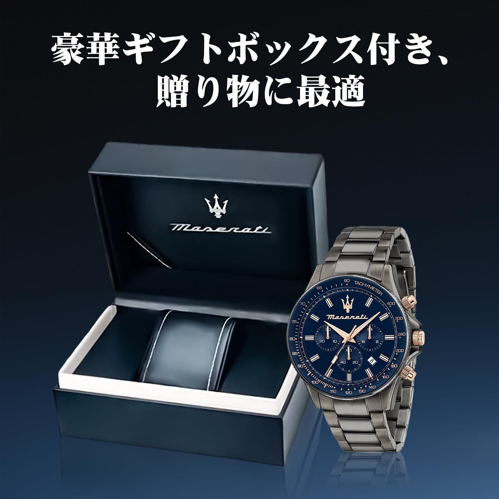 エレガントなデザイン:マセラティのSfidaコレクションから登場したこのメンズ腕時計は、44mmのスチール製ケースにブルー文字盤が特徴です。回転ベゼルとローレット仕上げの側面が、スポーティーでありながらエレガントな印象を与えます
