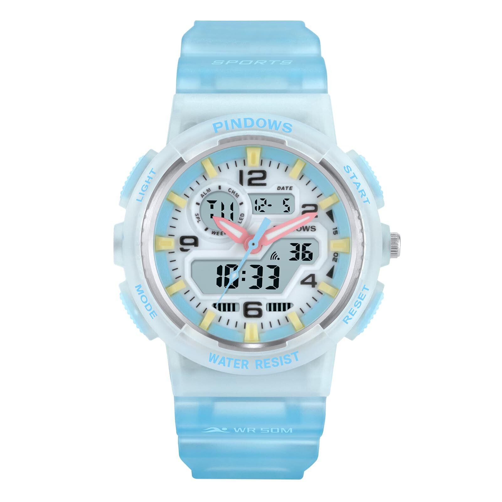 PINDOWSレディーススポーツ腕時計 アナログデジタルLEDディスプレイ 50m防水仕様、多機能フィットネストラッカー ランニング、ハイキング、アウトドアアドベンチャー用