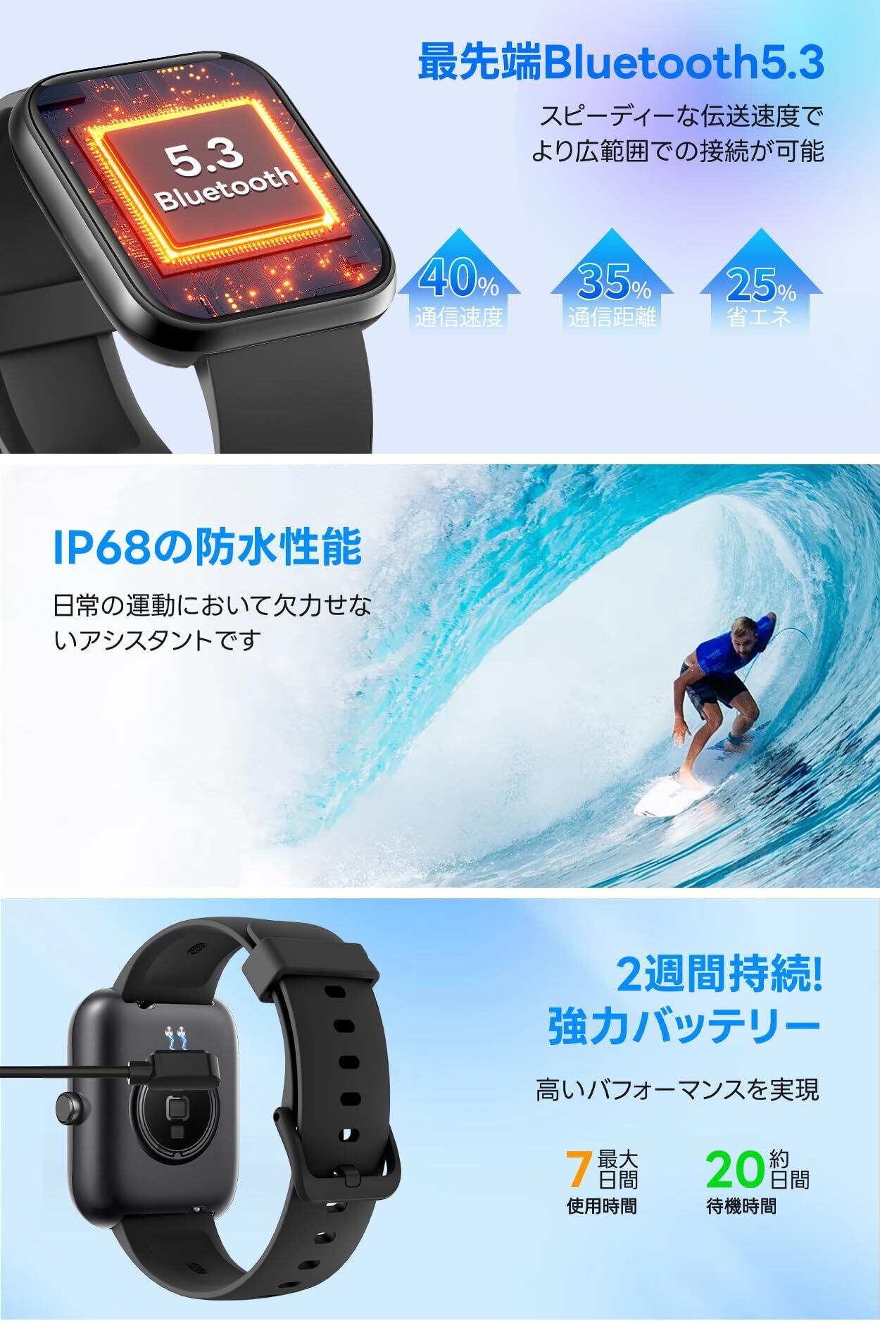 【100種以上のスポーツモードに対応&IP68防水】スマートウォッチには100種類以上の運動モードを搭載しており、ウォーキング、ランニング、ヨガ、フィットネス、バスケットボール、水泳など多様なアクティビティをしっかり記録します。歩数、運動距離、消費カロリーも正確にモニタリングされるため、日々の健康管理やダイエットにも役立ちます。さらに、IP68等級の防水仕様により、手洗いや洗顔、雨の日の使用でも安心。汗をかくトレーニング時にも気にせず使えます。(※お風呂・サウナ・温泉での使用はご遠慮ください。)