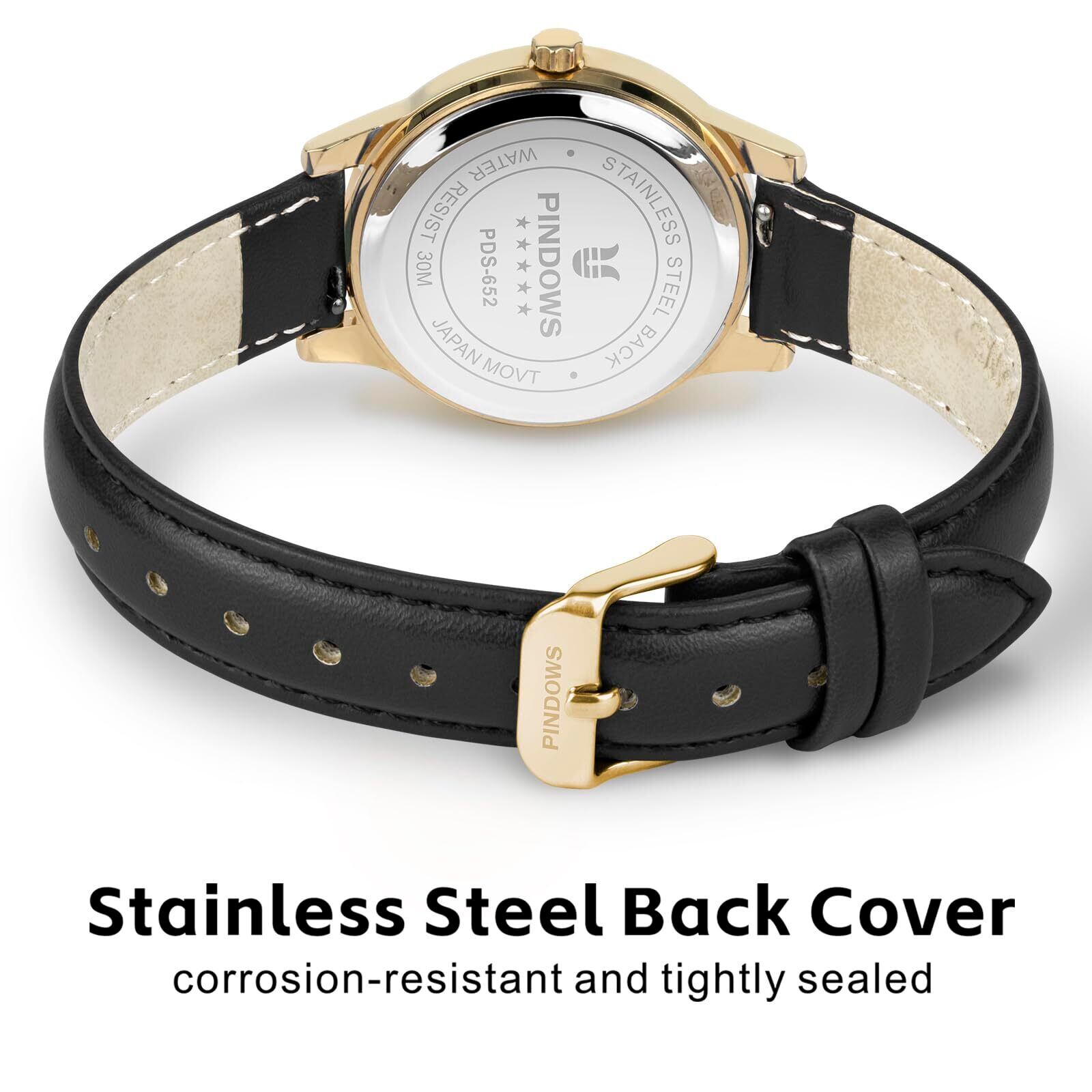 PINDOWS女性用スリムなミニマリストクォーツアナログ腕時計 ブラックレザーストラップ付きゴールドトーンケース おしゃれでエレガントな日常使い用腕時計