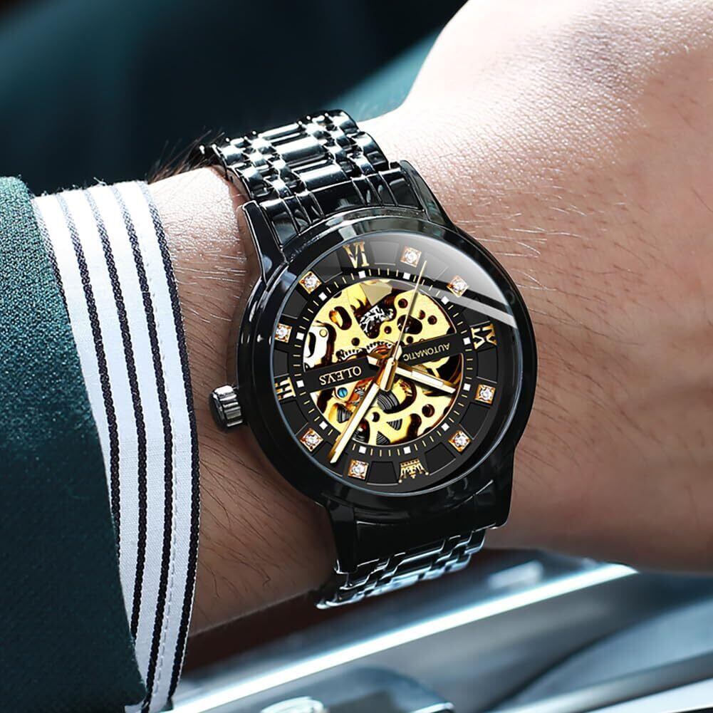 OLEVS 腕時計 メンズ おしゃれ 自動巻き 機械式 紳士 ファッション 防水 夜光 ブランド ステンレス ブラック 黒 時計 men watch (ゴールド/ブラック9901)