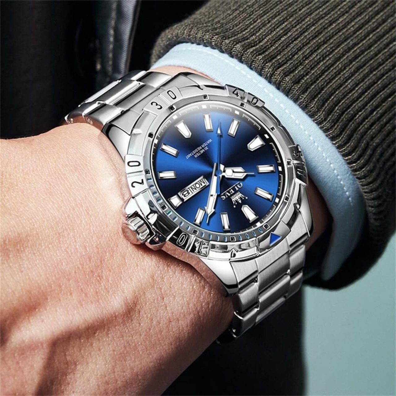 OLEVS 腕時計 メンズ クオーツ 人気 おしゃれ かっこいい 多機能時計 ステンレス 防水 夜光 日付 アナログ ファッション 学生 会社 watch for men (ブルー)