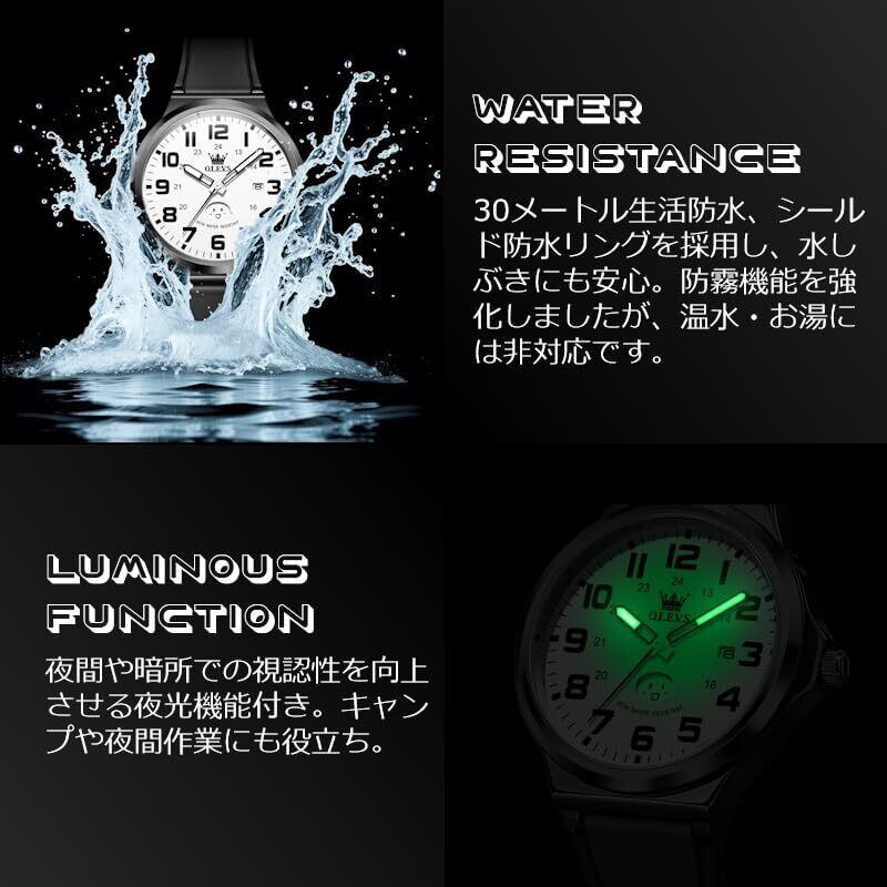 [夜光と防水]夜光機能があり、周囲に光がない場合でも簡単に時間を確認できます。30Mの優れた防水性を備え、日常生活での汗や洗顔時の水滴、にわか雨などに対応できます。