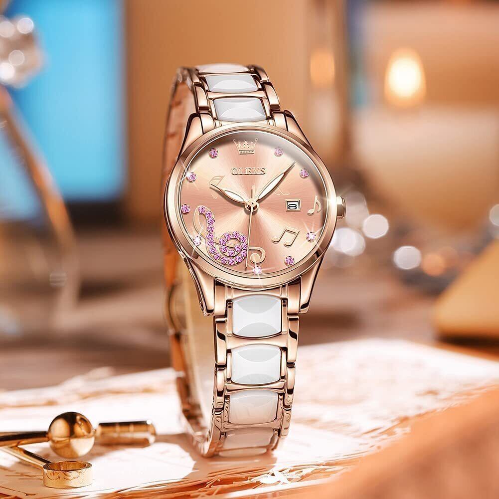 OLEVS 腕時計 レディース おしゃれ クォーツ 女性用 うで時計 日付 人気 夜光 防水 見やすい ピンク ブレスレット付き セラミック