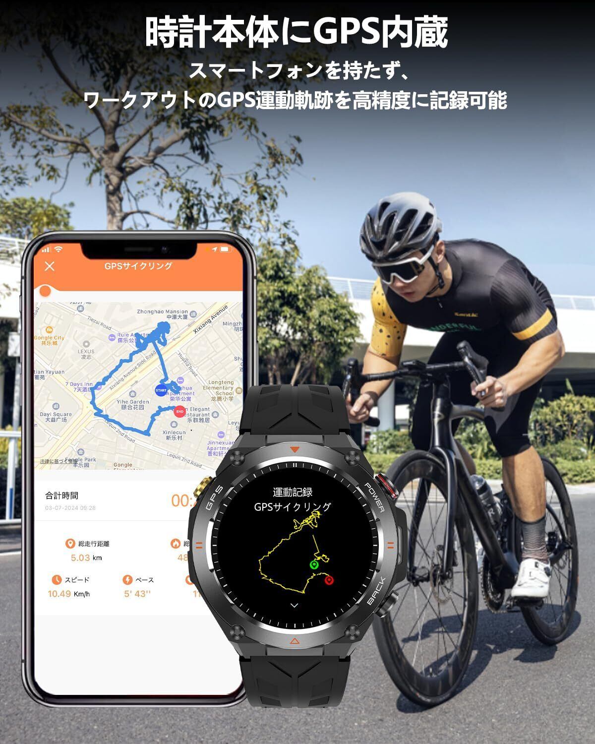 【2025業界革新モデルGPS内蔵スマートウォッチ・4衛星測位システム&軍用規格&1.45インチ大画面】このGPS内蔵スマートウォッチは4衛星測位システム(GPS、GLONASS、GALILEO、BDS)に対応しております。GPS内蔵ですので、スマホを持たず運動軌跡を記録できます。最高の安定性&正確性を実現しました。ビルが立ち並ぶ都市部のランニングやサイクリングなどでも、環境やマルチパスの干渉を受けにくい測位をお楽しみください。スマートウォッチは特殊な複合材料を採用され、耐低温、耐高温、耐衝撃、防水防塵など、多くの軍用標準テストに合格することができます。スポーツウォッチは、間違いなく野外活動のようなときにあなたの信頼できる仲間になることができます。Smart watchの画面は耐衝撃性のガラスが採用するため、耐久性と傷がつきにくくなっています。日常から過酷な自然環境まで、あらゆるシーンで適用されます。1.45インチのカラースクリーンを搭載され、412×412ピクセル高解像度で、太陽光の40%を反射する性質があり、大きなフォントで屋外でも老眼の方でも情報やデータが見やすく表示されます。