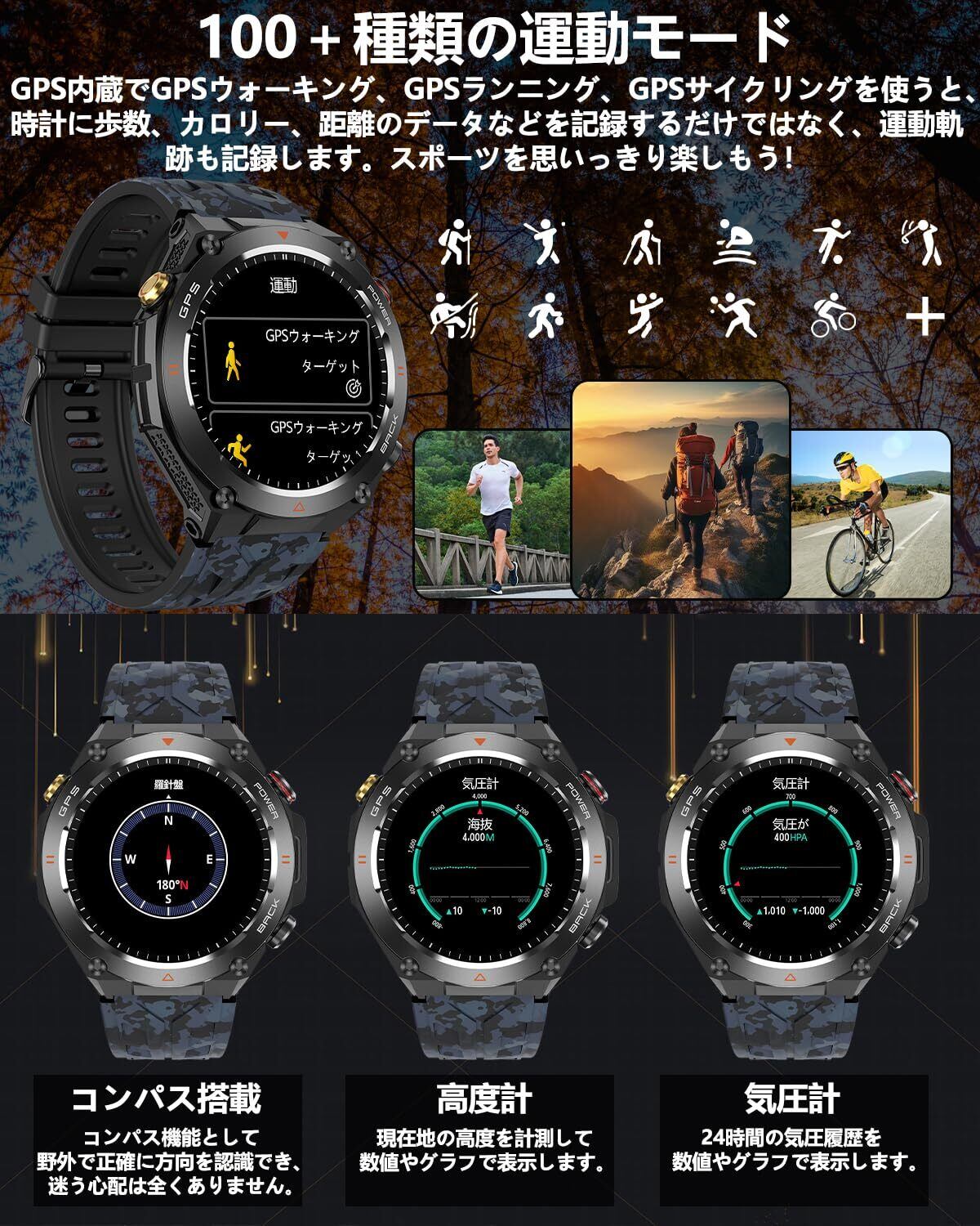 スマートウォッチ【2025年新設計 時計にGPS内蔵 軍用規格 迷彩柄バンド付き】スポーツウォッチ 耐衝撃 コンパス搭載 Bluetooth5.3通話 1.45インチ大画面 腕時計 15日間ロングバッテリー 100+運動モード 文字盤DIY 振動と着信音設定 高度計 気圧計 腕時計 1ATM防水 Lineなど通知 天気 ゲーム 音声アシスタント 歩数計 iPhone アンドロイド対応 日本語説明書