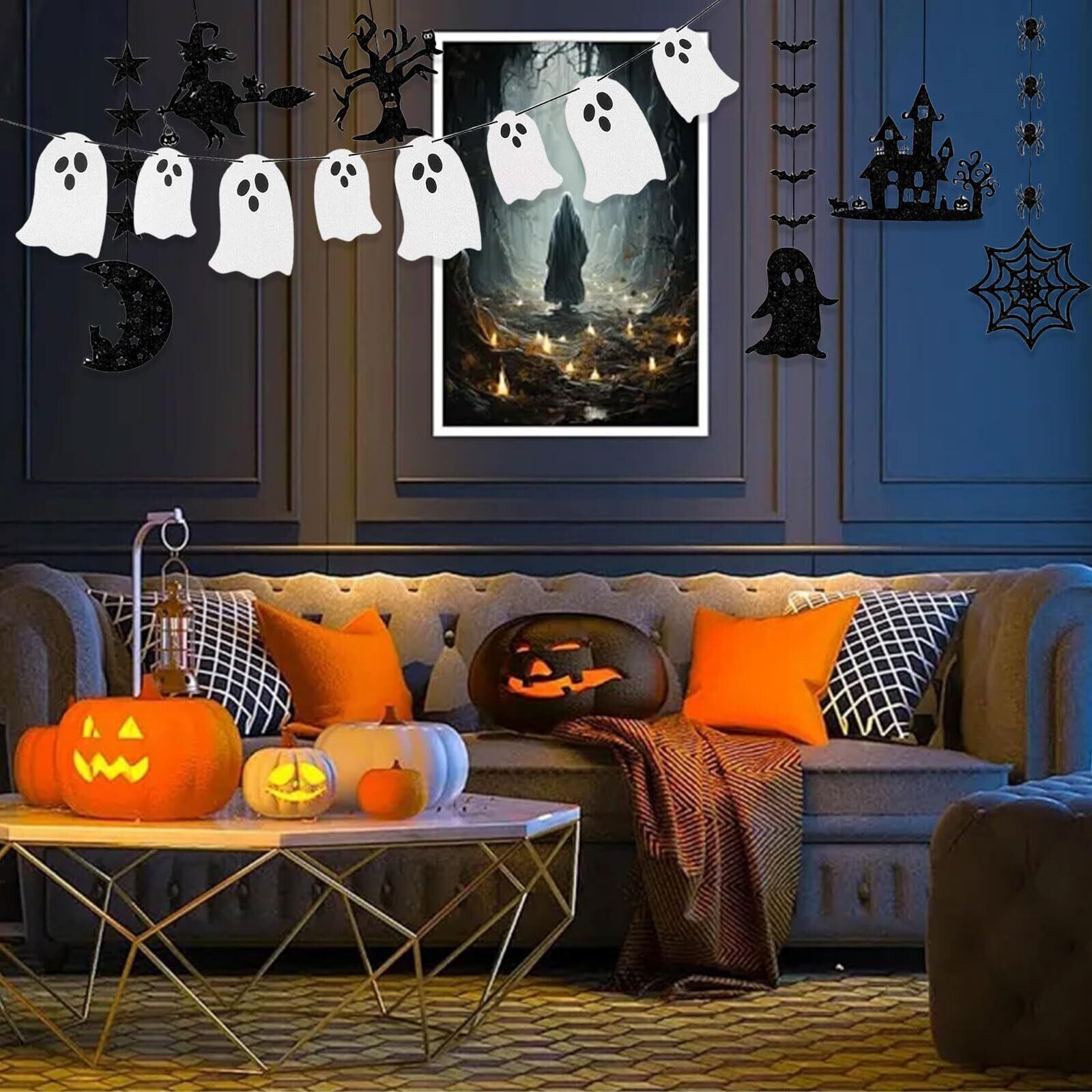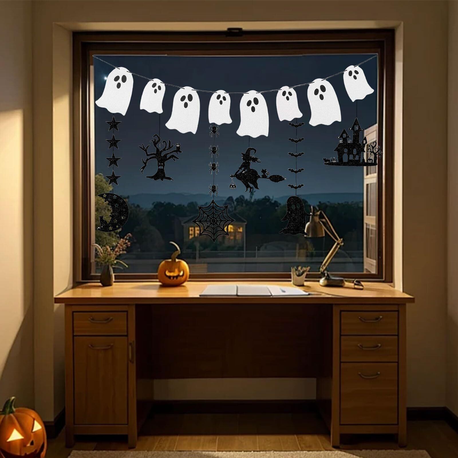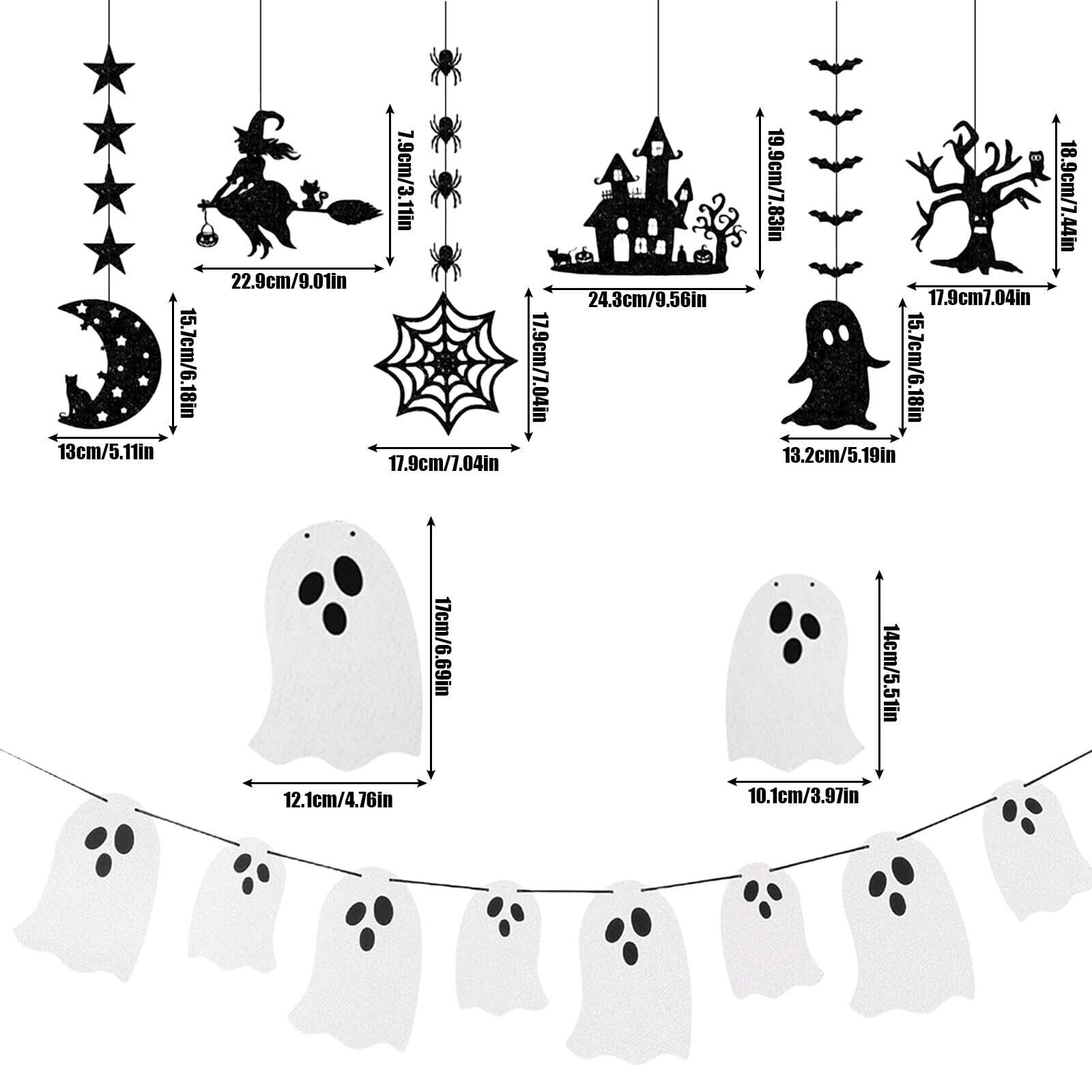 【使いやすい】6つの黒いガーランドが組み立てられており、直接飾ることができます。おばけガーランドは組み立てていない状態で紐が付いており、大小8つのおばけに紐を通すだけで完璧なおばけガーランドが完成します。取り付けも取り外しも簡単で、好きな場所に掛けられます。