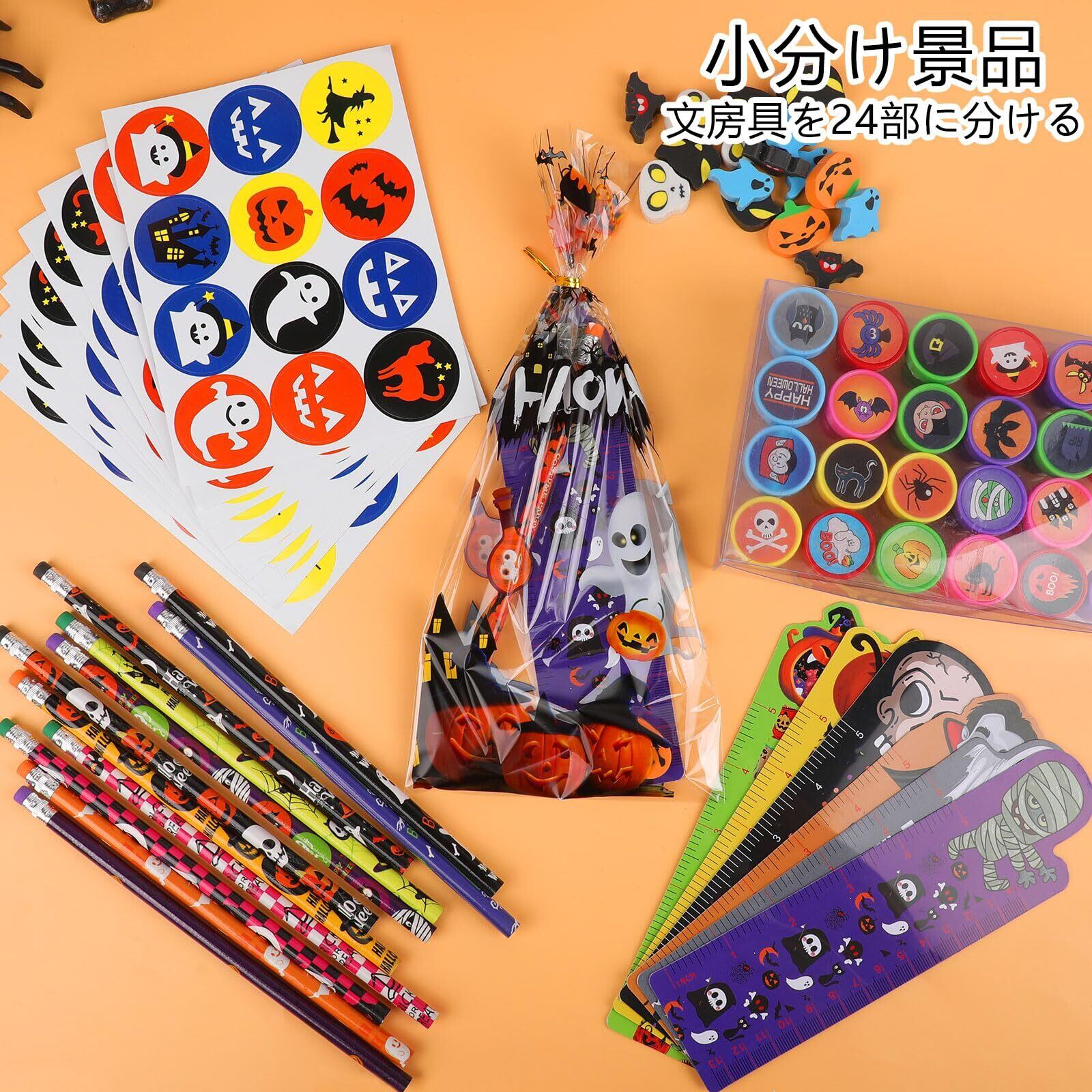 小分け景品:ハロウィン袋が付いているので、文房具を24部に分けることができます。学校、家族、店舗で楽しむハロウィンパーティーやくじ引きに最適な景品です。