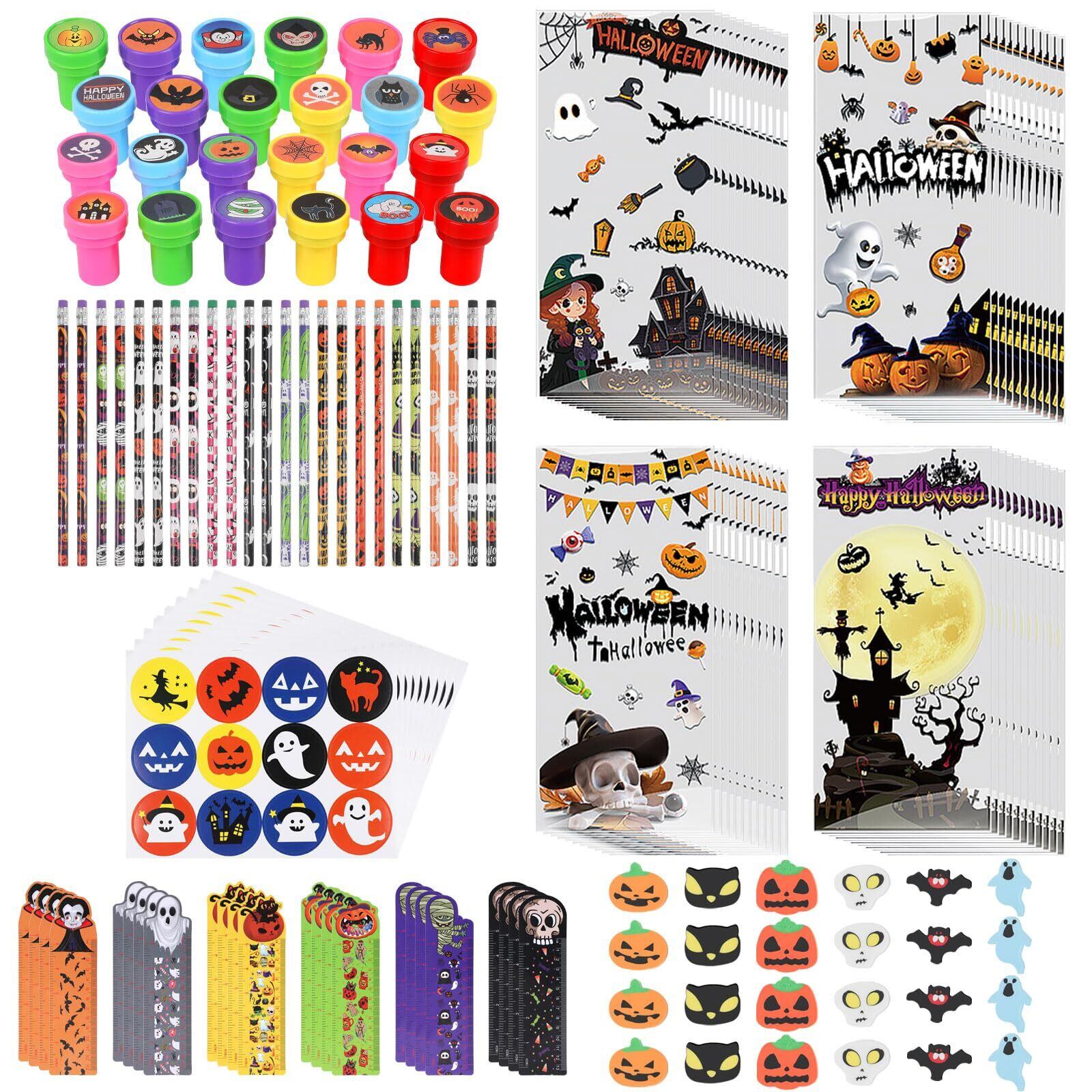 【170点セット】えんぴつ×24本、消しゴム×24個、スタンプ×24個、ご褒美シール×24枚、ブックマーク定規×24枚、ハロウィン袋×50枚