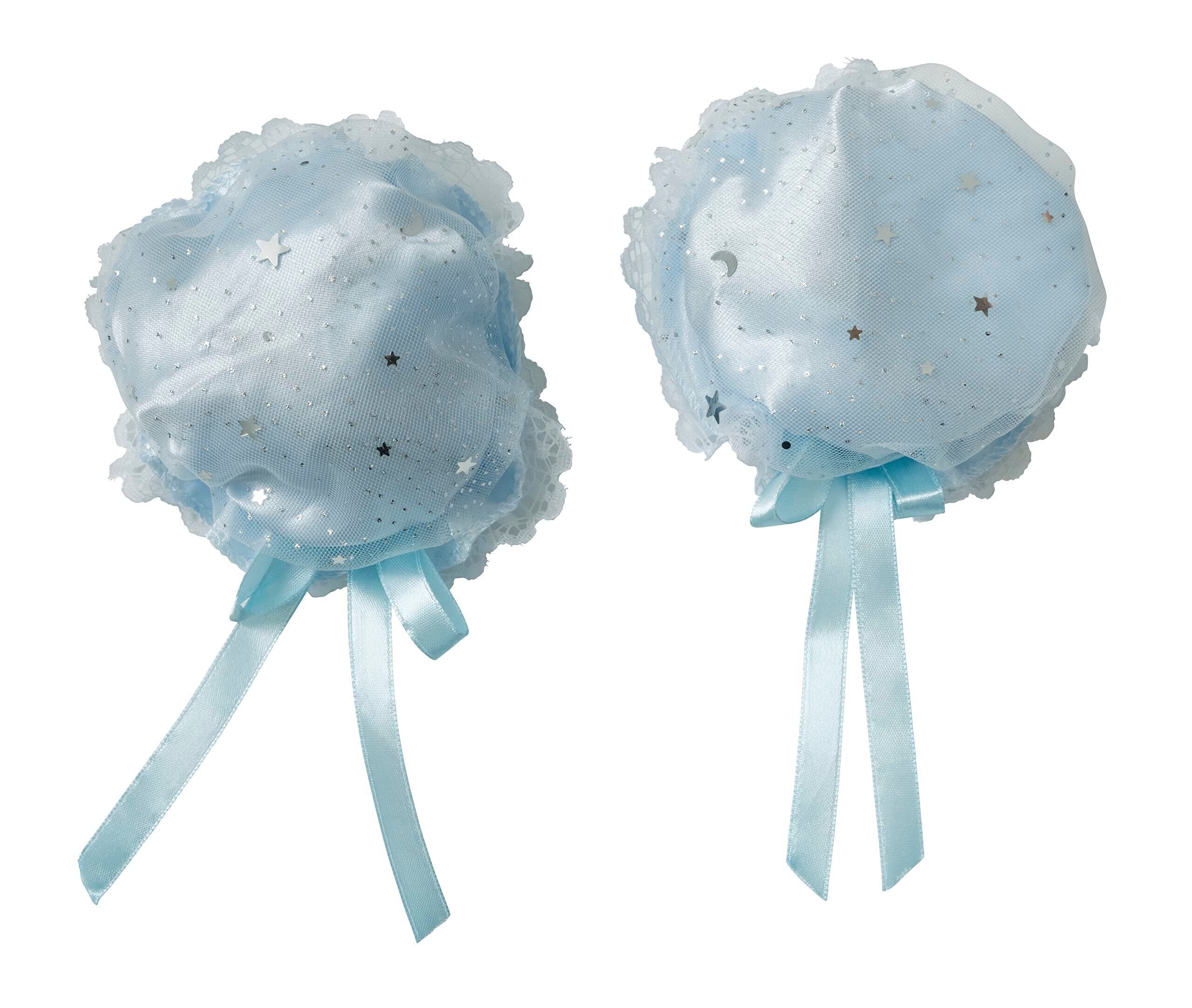 パステルブルーのサテン生地にシースルーのキラキラ生地を重ねたお団子カバー。