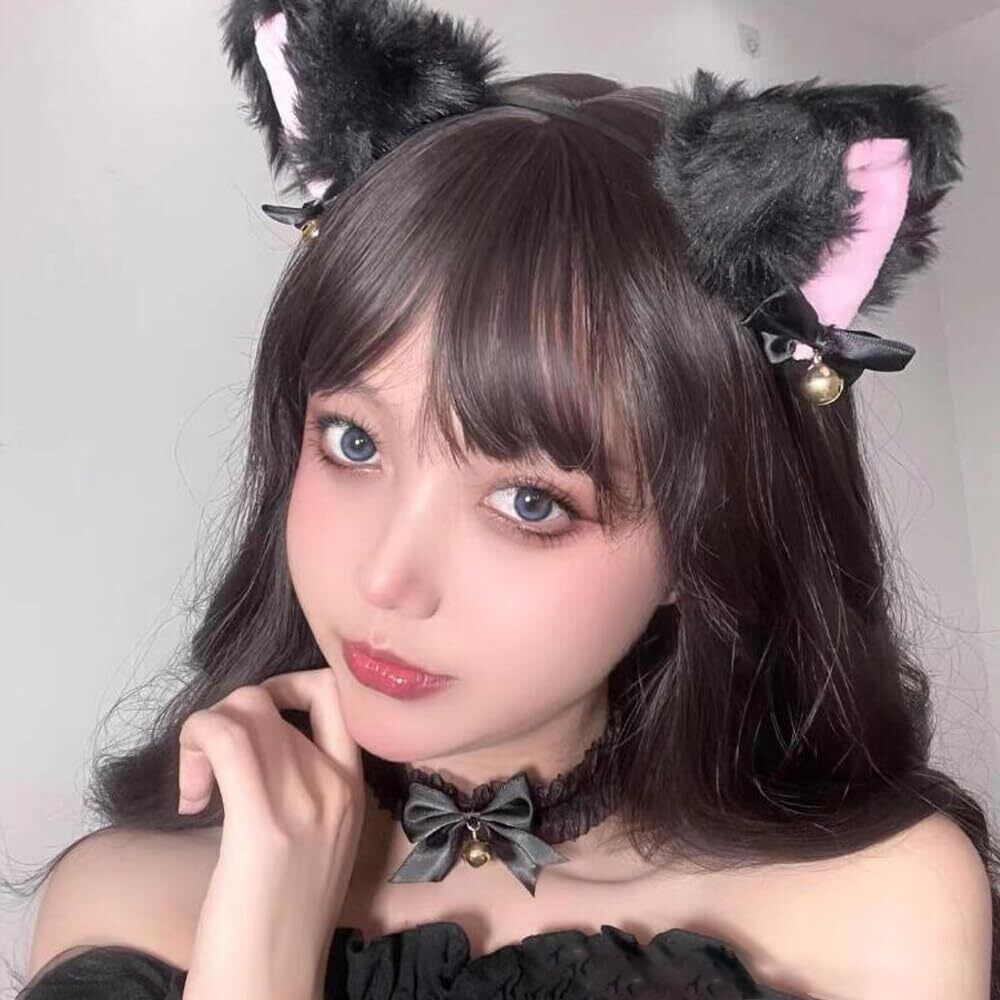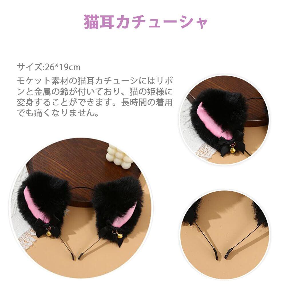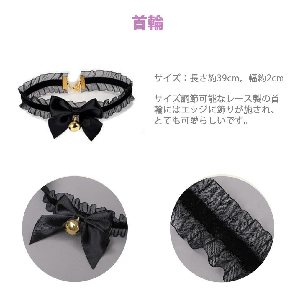 【猫耳カチューシャと首輪】モケット素材の猫耳カチューシにはリボンと金属の鈴が付いており、猫の姫様に変身することができます。長時間の着用でも痛くなりません。サイズ調節可能なレース製の首輪にはエッジに飾りが施され、とても可愛らしいです。
