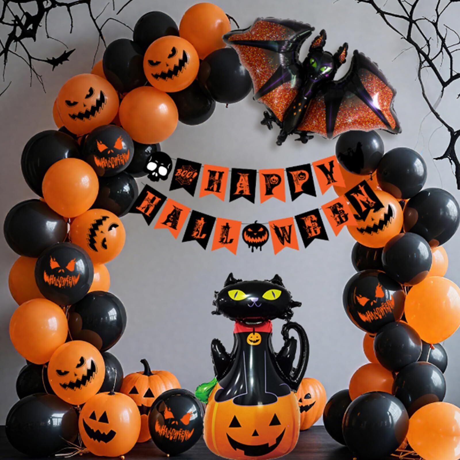 koundeneko ハロウィン飾り 風船 70点セット Happy Halloween バナー ラテックス風船 コウモリ バルーン ハロウィン 飾り付け オレンジ ブラック バルーンブーケ 写真撮影背景 テーマパーティー用品