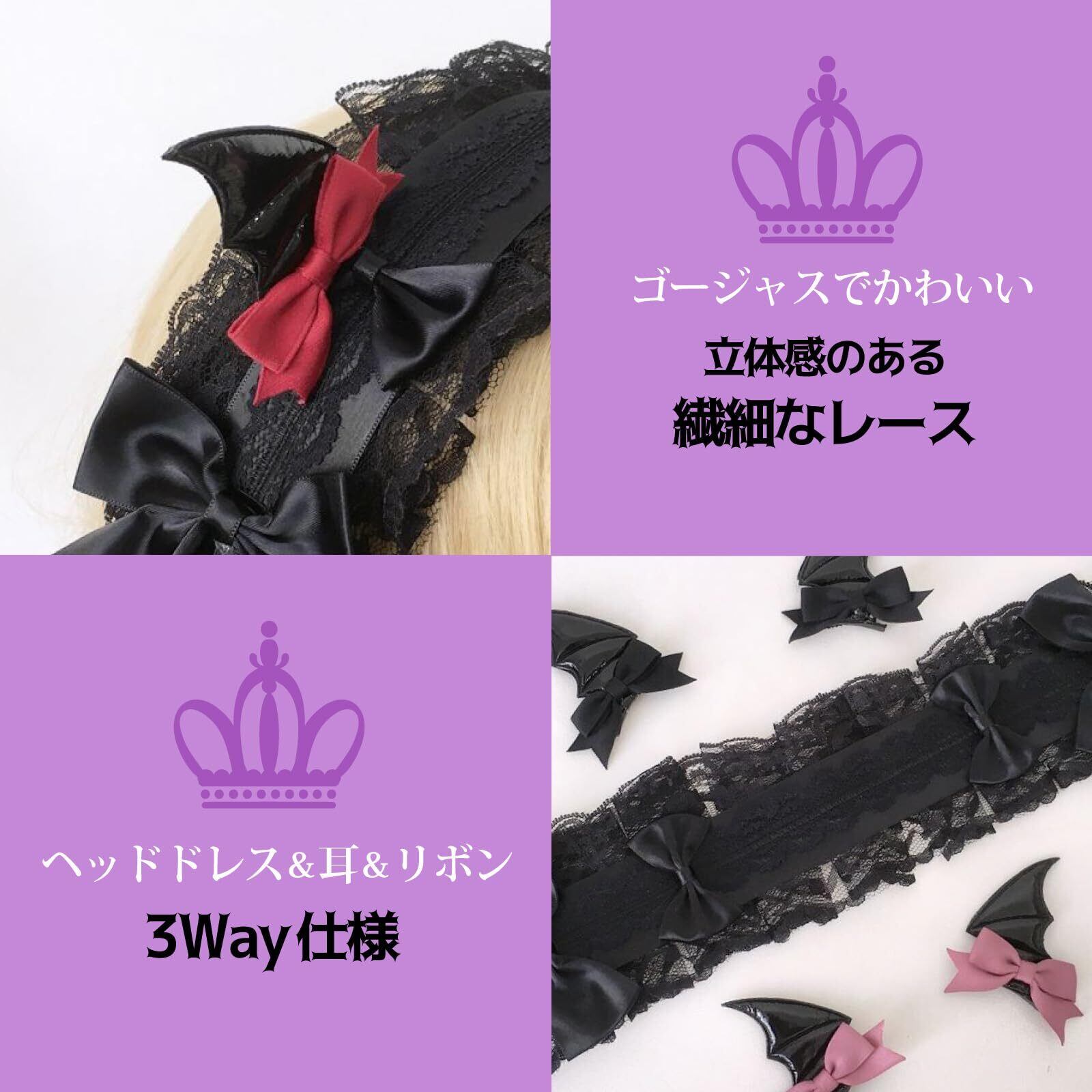 【機能】3Way、繊細なレース、耳、悪魔リボン取り外し可能【素材】本体レース、髪留め金属【カラー】カチューシャブラック、耳ブラック、リボン(ブラック、レッド、ピンク)※モニターの環境により、色の見え方に若干差が生じる場合がございます。
