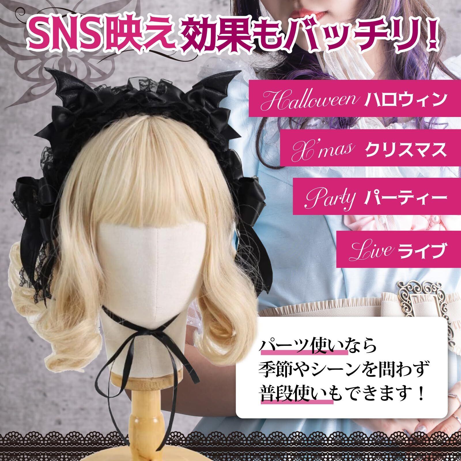 レースリボンヘッドドレスは、ハロウィン、クリスマス、パーティー、ライブ、イベントはもちろんパーツ使いなら季節やシーンを問わず普段使いできるのも人気の秘密。一つで3つのコーデが楽しめる。初心者さんにおススメ!