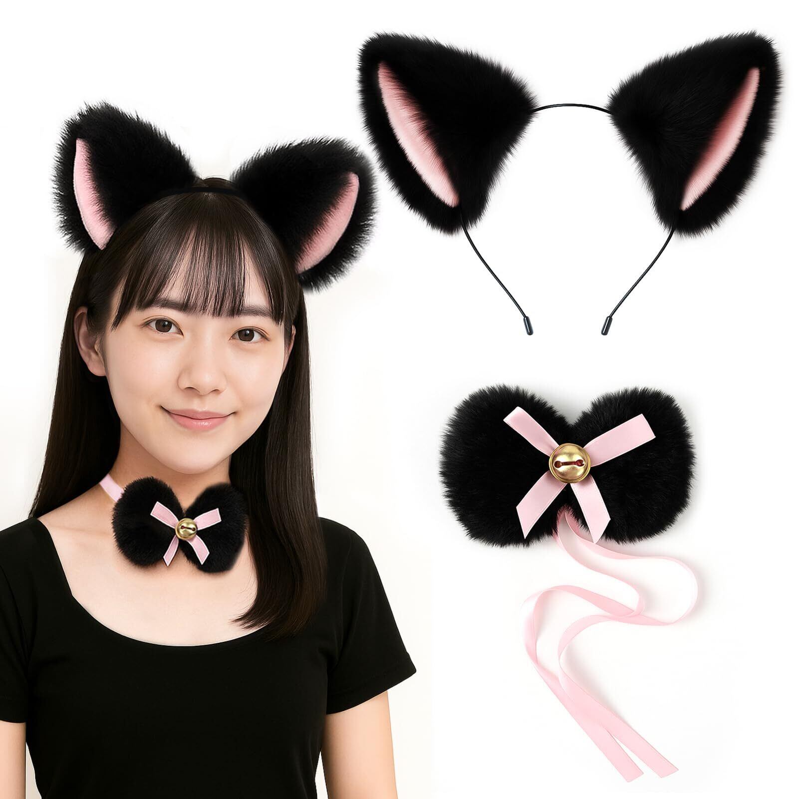かわいい - ふわふわの黒い猫耳が付いたカチューシャと、鈴やピンクのリボンがアクセントの首輪がセットになった可愛いアクセサリーです。猫耳は左右に動かせるので、お好みの位置で調整できます