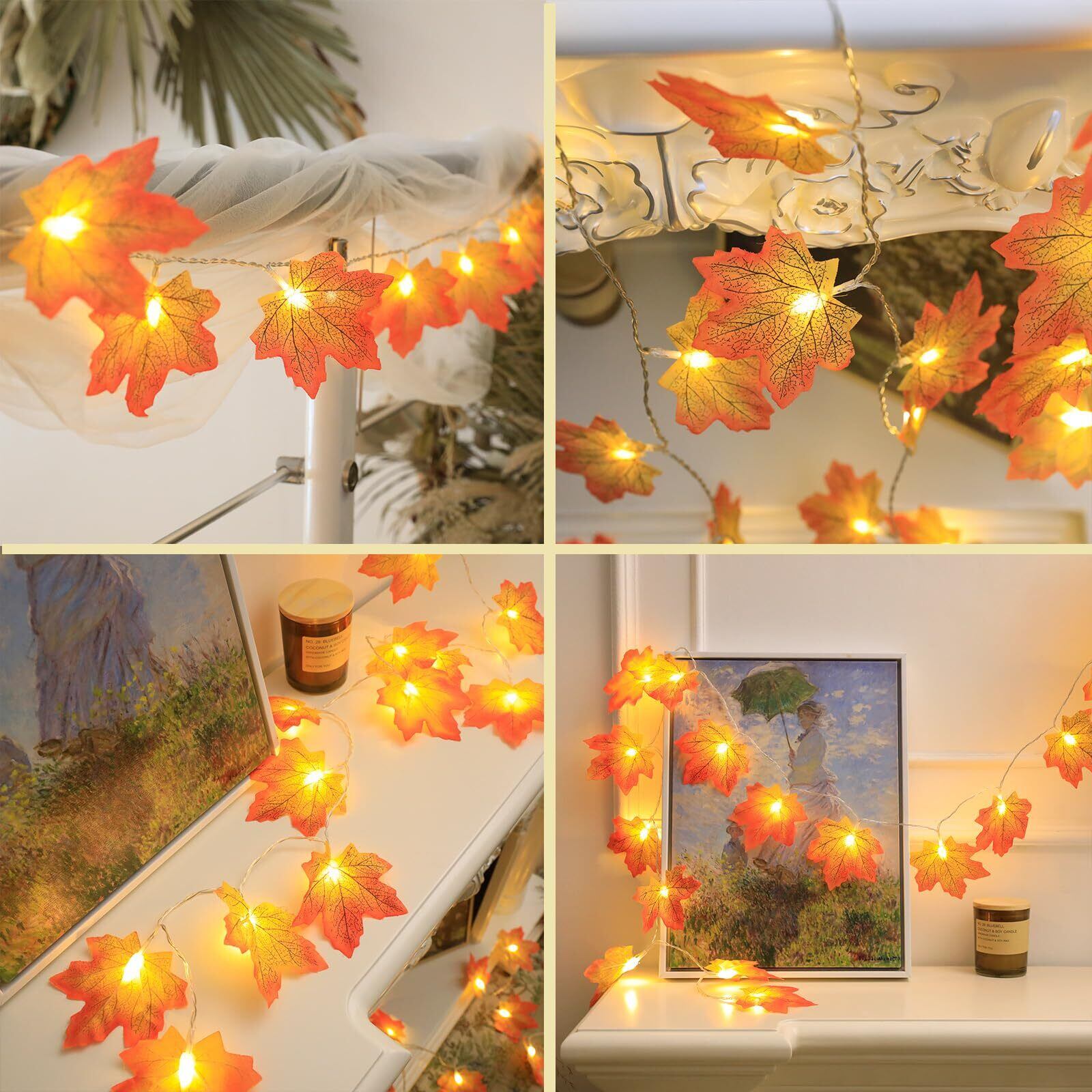 【ハロウィンに欠かせない装飾】:電源を入れると、紅葉が暖かい光を溢れ出します。暖かい光で夢幻的な暖かい秋の雰囲気を作られます。これは感謝祭やハロウィンにぴったり装飾ライトです。壁にかけたり、垂らして飾ったりして、自由に他の物と組み合わせ、素敵に飾り付けできます。