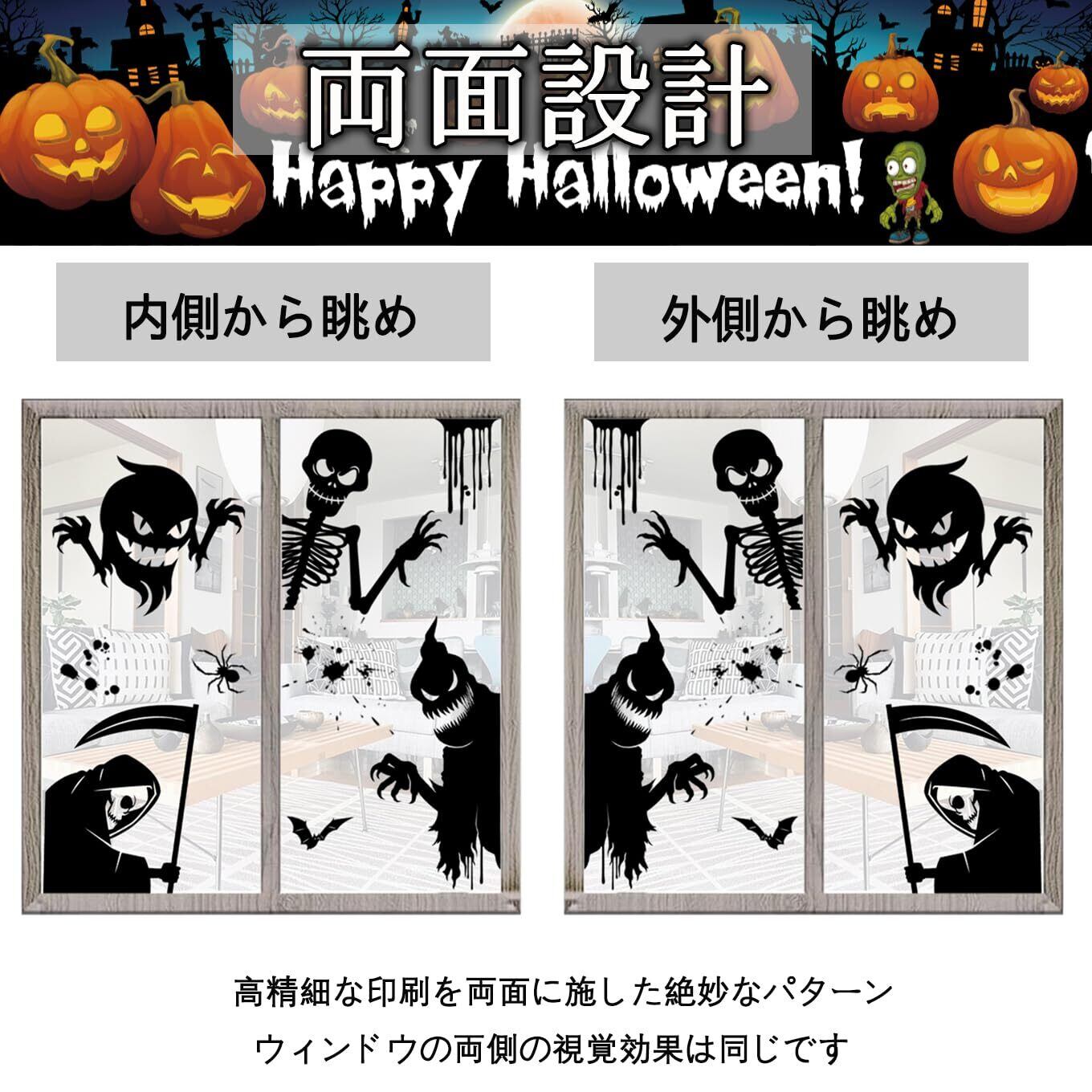 【両面設計】高精細な印刷を両面に施した絶妙なパターン。窓の外側からも内側からも同じく鮮明で美しいデザインを楽しめます。これにより、外から訪れる人々にもハロウィンの雰囲気を感じさせることができ、パーティーやイベントを盛り上げます。ステッカーは防水加工されているため、雨や湿気のある場所でも使用可能です。