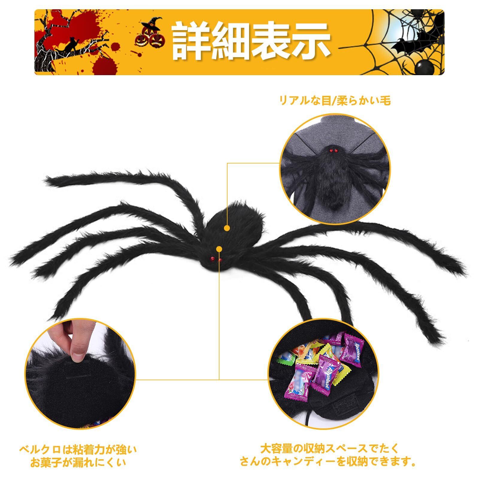 【ユニークなキャンディーバックパック】この巨大なクモは、クリエイティブなデザインで2本の弾性ストラップと開閉できるクモの口が付いています。背中にこの偽のクモを背負ってどこでも他人を驚かせながら、集めたお菓子をクモのバッグに入れることができます。