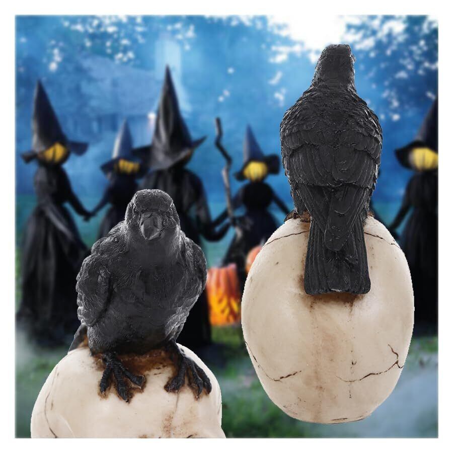 ツルハシガラスのオーナメント:黒いカラスと怖い頭蓋骨で構成されています。骨にひびが入ったリアルな形で、ハロウィンの家の装飾や庭の装飾に最適です。