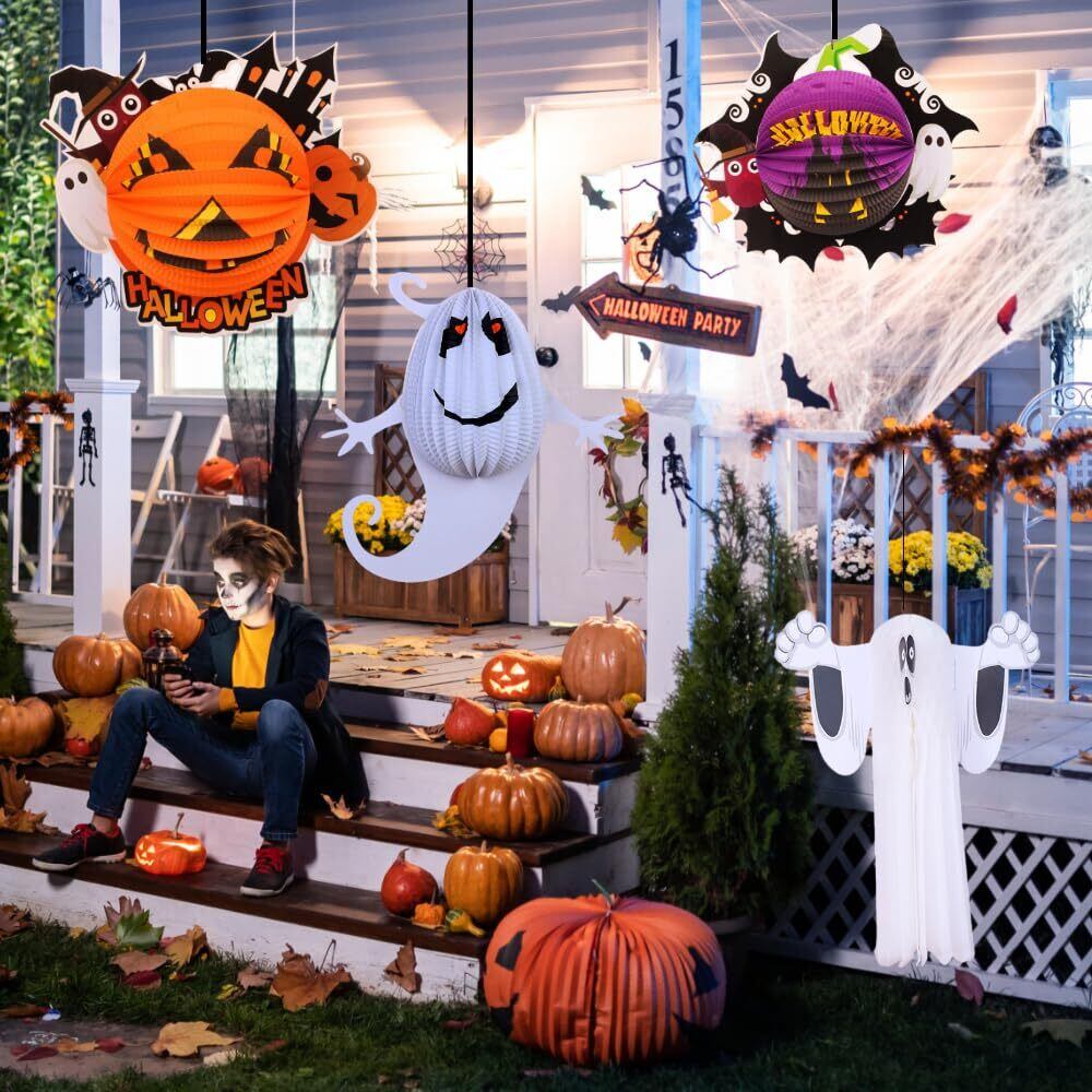 【ハロウィンデコレーションセット10点セット】ペーパー提灯、カボチャ提灯、幽霊、コウモリ、クモなど、さまざまなテーマの装飾が含まれ、気軽にホラーで楽しいお祭り気分を演出します。