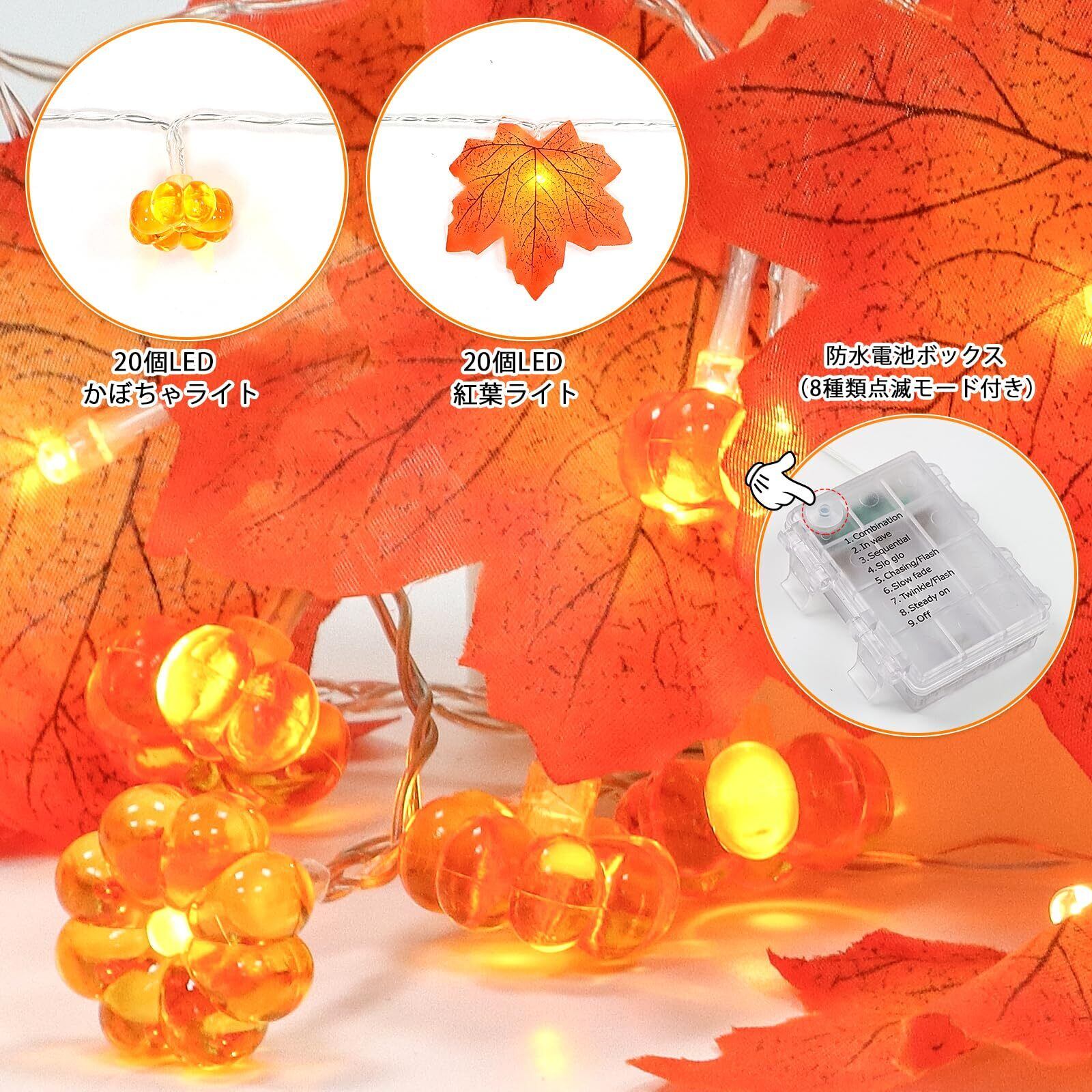 【商品仕様】:カボチャライト全長:6m;間隔:15㎝ 電球数: 40個LED電球(20個紅葉ライト+20個カボチャライト)素材:プラスチック、点灯モード: 8種類点滅モード; LED発光色:ウォームホワイト; 電源:単3乾電池×3本(別売り)