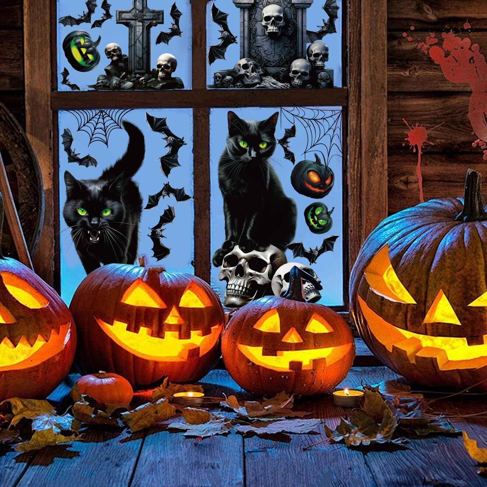 DERAYEE ハロウィン ウォール ステッカー 静電気 70pcs入り 黒猫 カボチャ 墓石 骸骨 シール 飾り 剥がせる 汚れない 怖い DIY halloween 部屋 窓ステッカー 装飾品 ガラス 窓 鏡