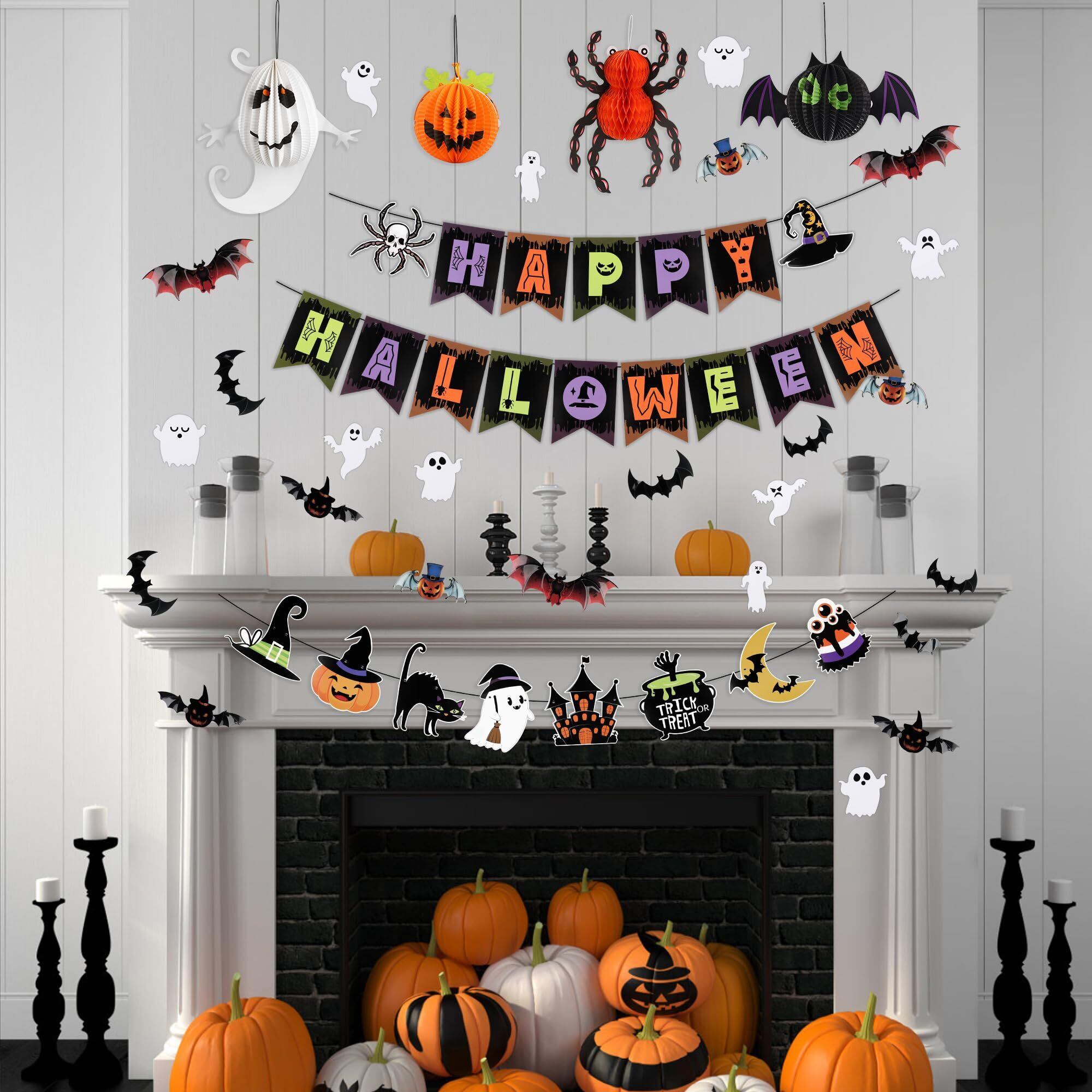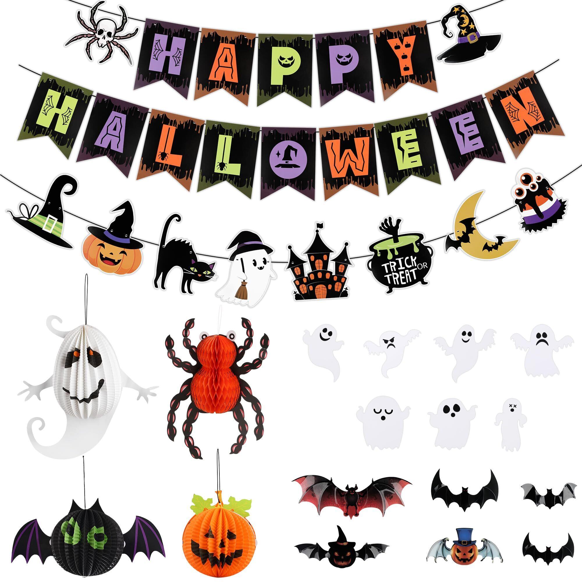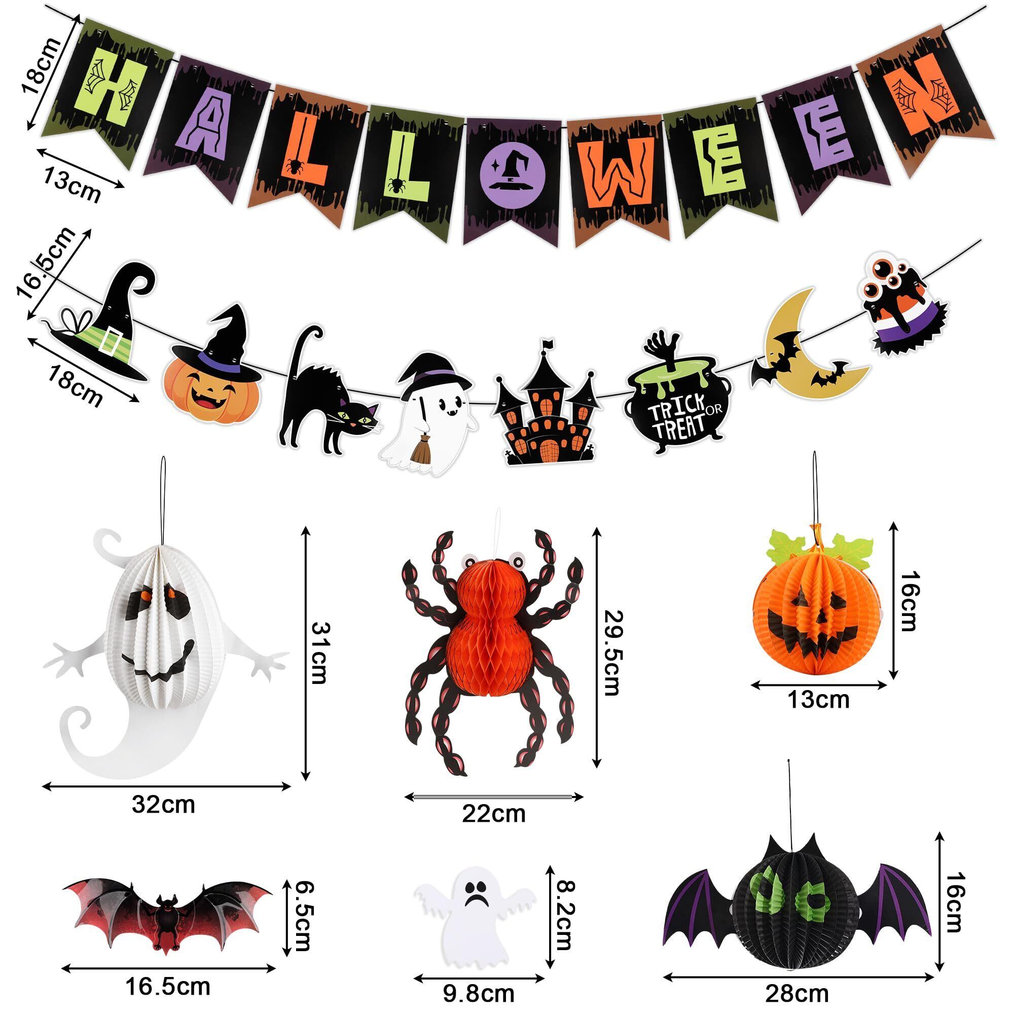セット内容:ハニカムボール×4個、「HAPPY HALLOWEEN」のフラッグバナー×1点 +3Dコウモリ貼りx10点+白い幽霊シールx21点。