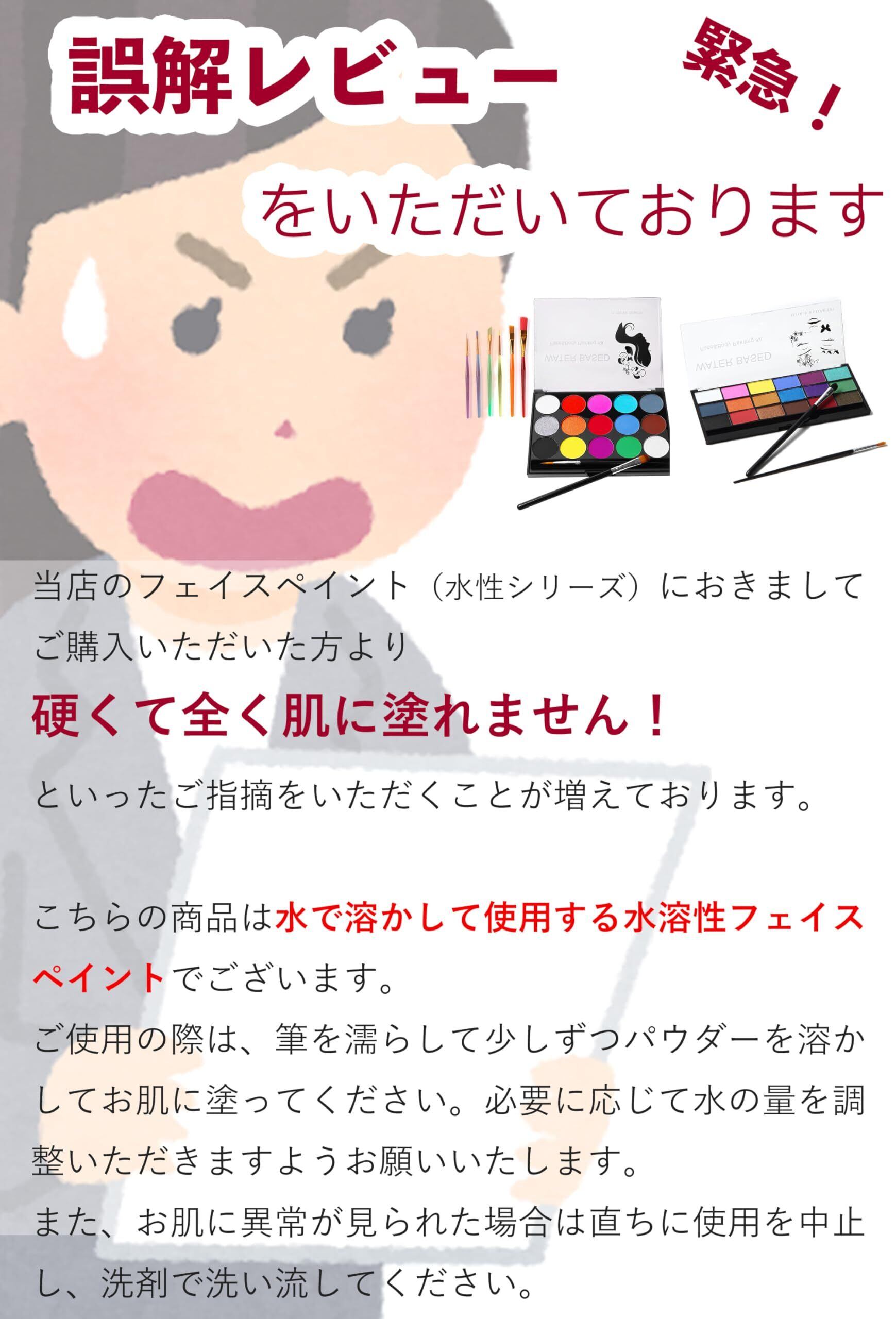 当商品は水性のフェイスペイントです。水やぬるま湯で簡単に洗い落とすことができます。落ちにくい場合は石鹸やボディーソープのご使用をおすすめします。