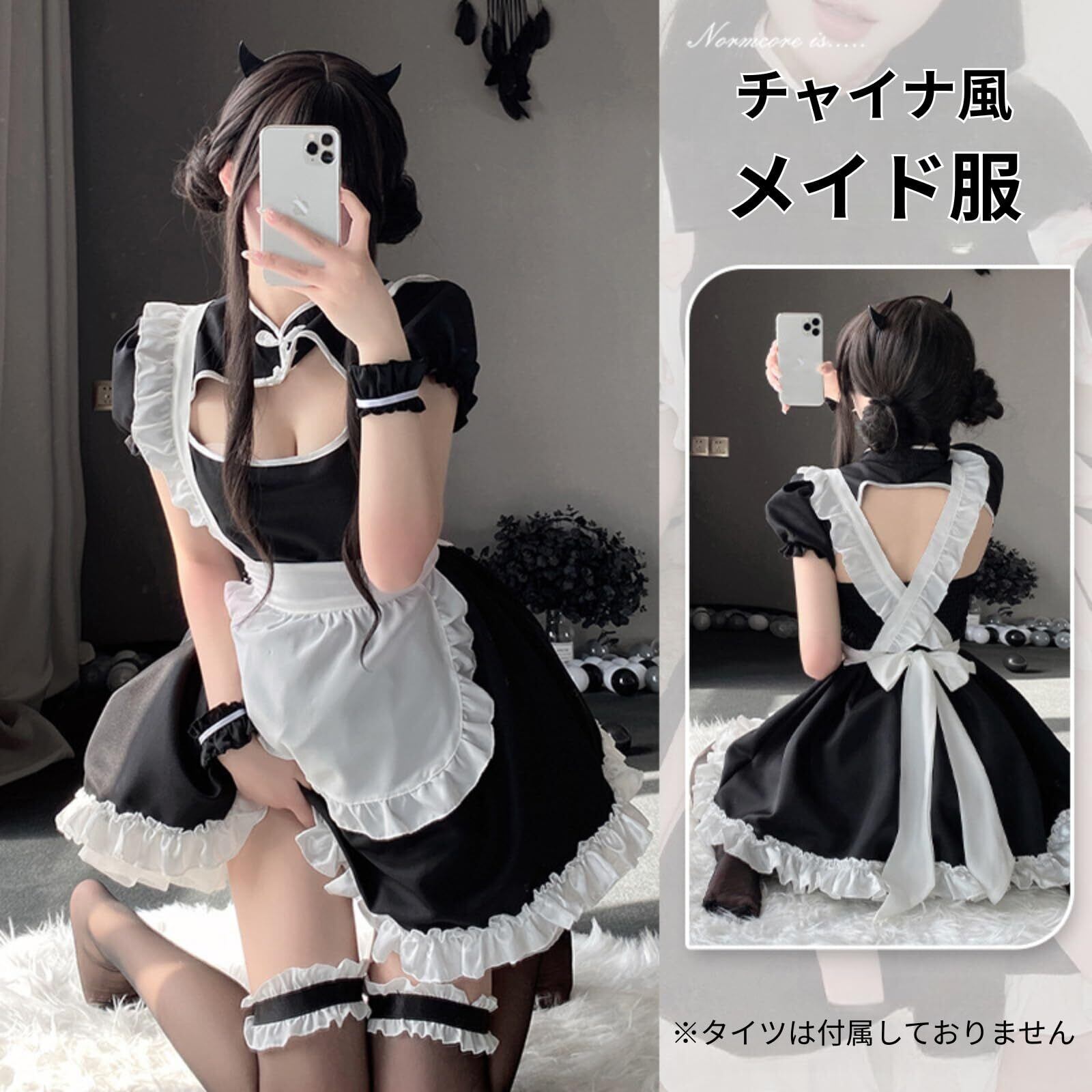 [TUISKU] チャイナ風 メイド服 コスプレ ハロウィン 仮装 チャイナ服 中華風 ロリータ 4点セット ワンピース エプロン ブレスレット ガーターリング フリーサイズ
