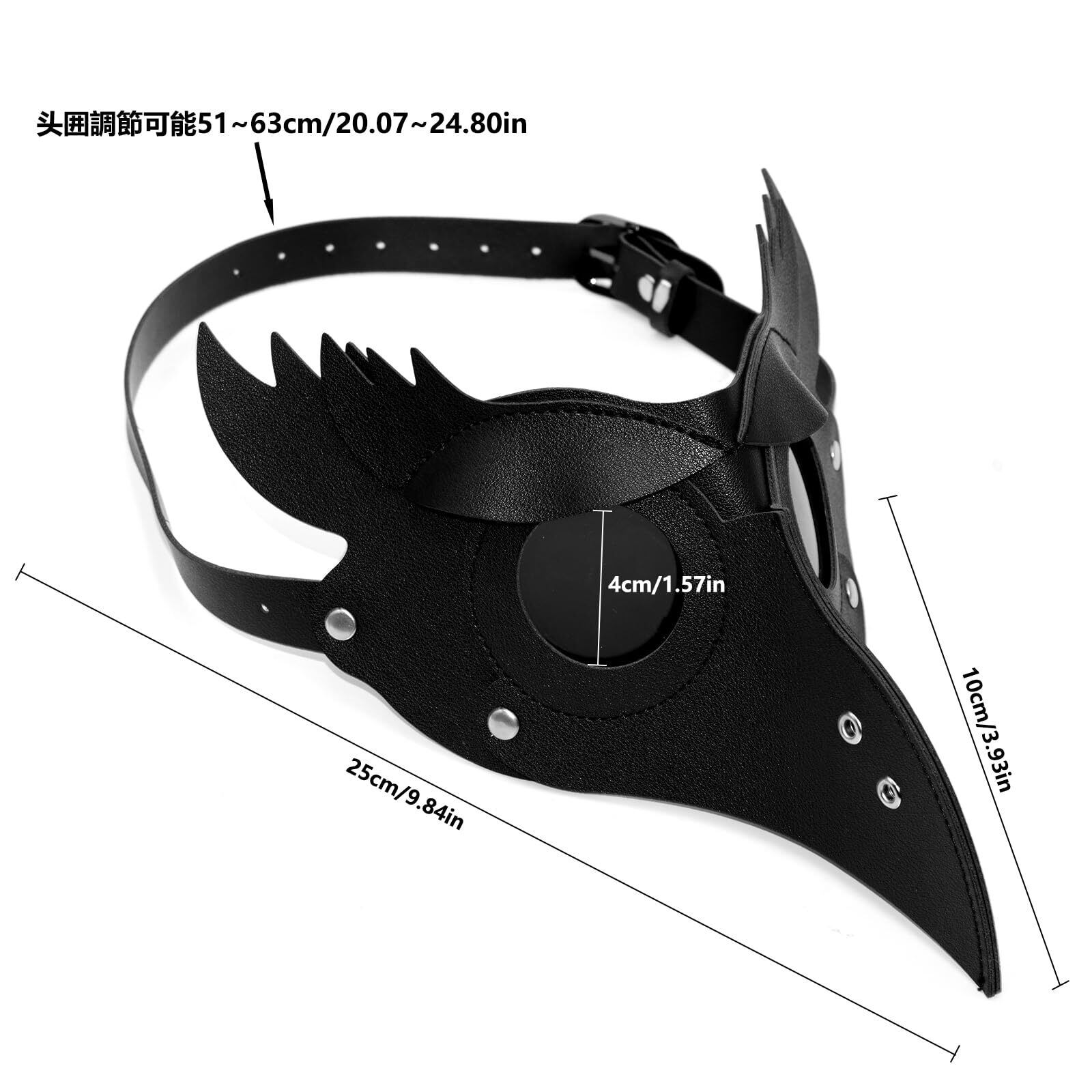【セット内容】ペストマスク1個入り。人工合成革を使用した高品質な素材で、サイズは18cm。大人用フリーサイズで、男女問わず快適に着用いただけます。