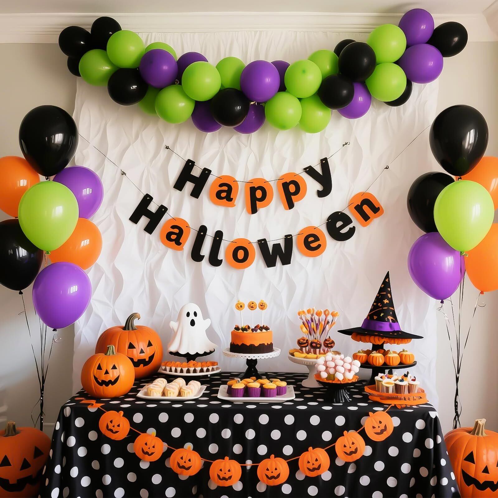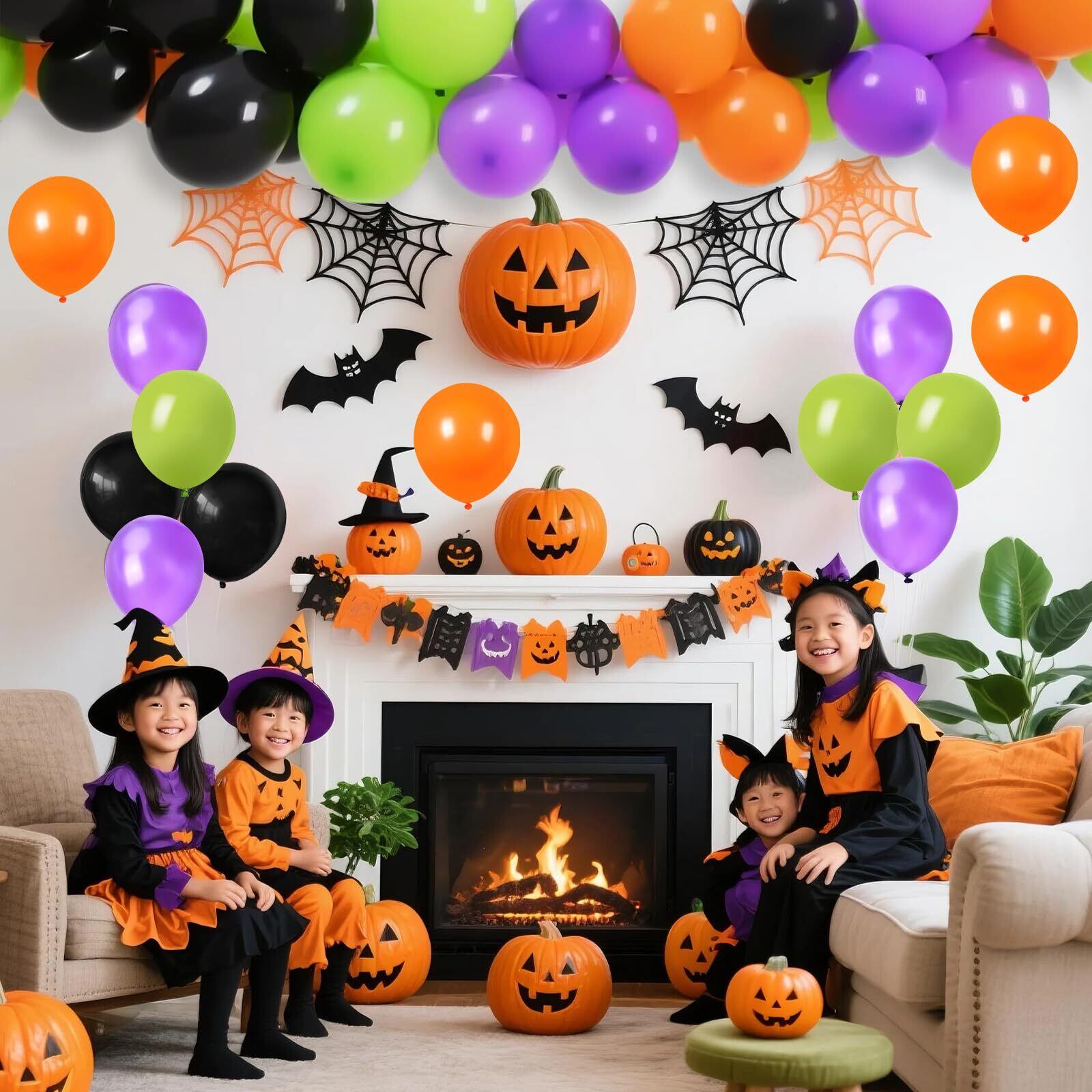 ■ハロウィンの飾り付けに、粘着シールを使って天井や壁に貼りつけることでふわふわ浮かせるように見せたり、リボンを付けて垂らしたり、バルーンチェーンで豪華なバルーンガーランドを作ったり……ぜひ、風船の飾り付けを活用して、特別なハロウィンを楽しく華やかに演出してください。