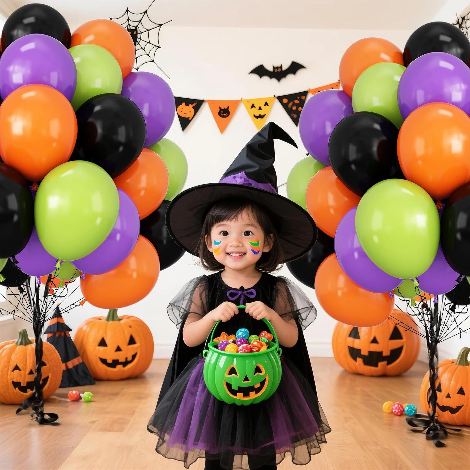 ■人気のラウンド風船50個入りのミックスバルーンセット。鮮やかなブラックとオレンジ、フルーツグリーン、パープルの配色はハロウィン限定で、目を惹くカラーがホリデームードを盛り上げ、パーティー会場を一気に華やかに演出します。