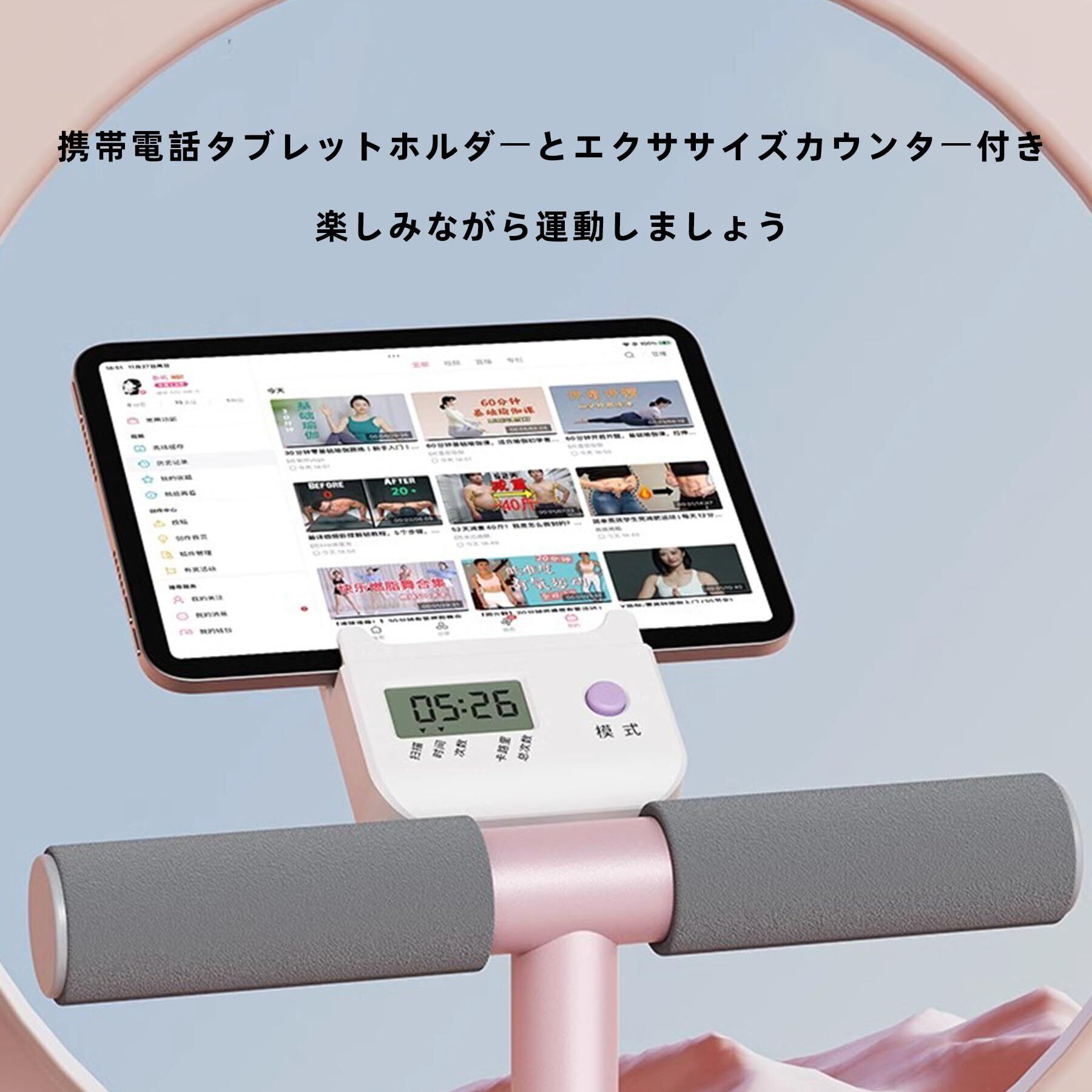 便利なカウンター&スマホスタンド:内蔵カウンターでトレーニングの回数を記録、スマホスタンド付きで動画を見ながらトレーニングも可能。エクササイズバンドプレゼントでトレーニング効果をさらに高めます。