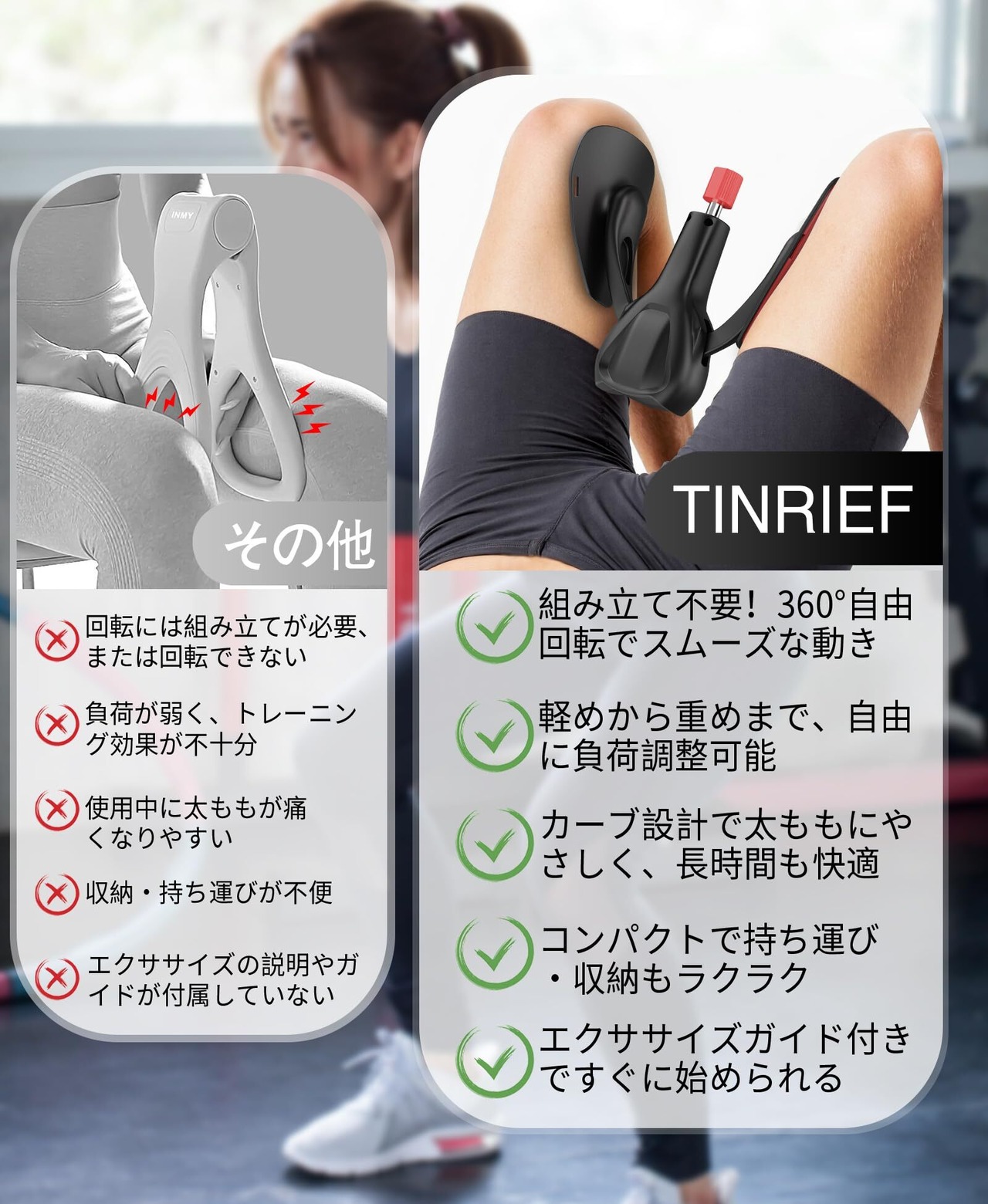 【快適設計 & フィット感調整機能】脚内転筋トレーニング機器として、360度回転式プレートを搭載。太もも・膝・二の腕にフィットさせ、ないてんきん 筋トレ効率を最大化。スタティック式と異なり、内転筋トレーニングに最適な負荷配分を実現。肌触りの良い素材で長時間のないてんきんトレーニング器具使用も快適。