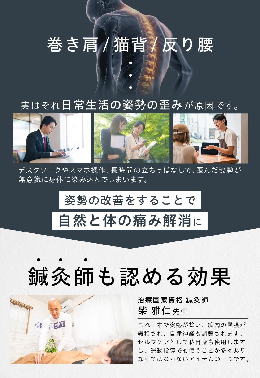 【ただ寝るだけで姿勢改善に】私たちは気づかないうちに身体を駆使しているため筋肉が緊張しています。ポールの上に寝ることで、緊張しやすい筋肉がほぐれ、自然と姿勢改善にもつながります。